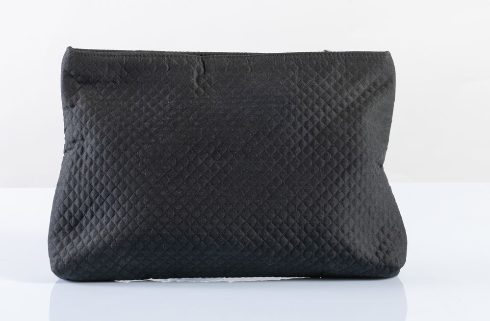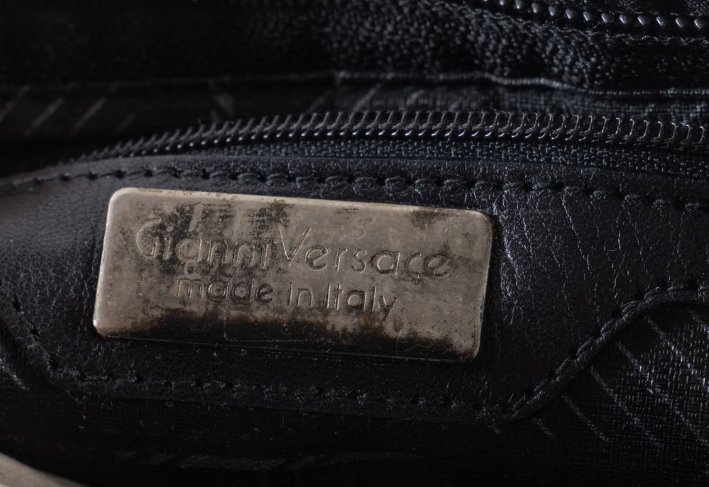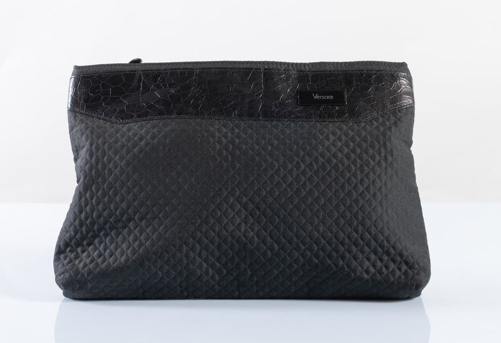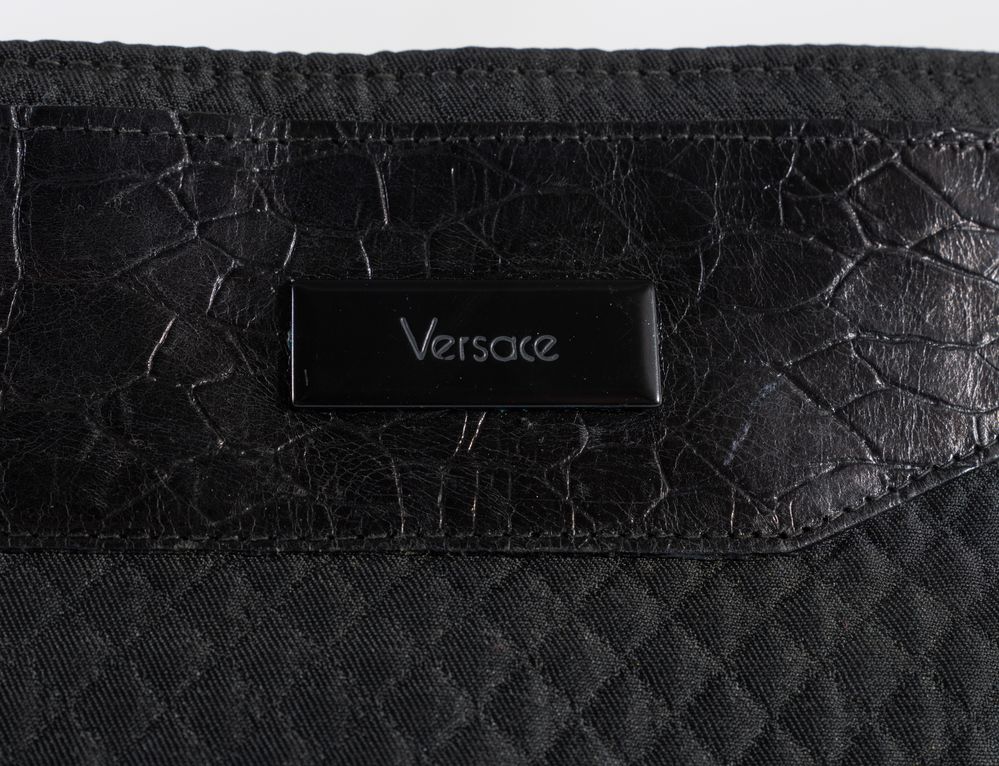 VERSACE Pochette in tessuto nero e inserti in pelle stampata coccodrillo. Cm 25x35x4. Reca marchi Versace, Gianni Versace, Made in Italy.