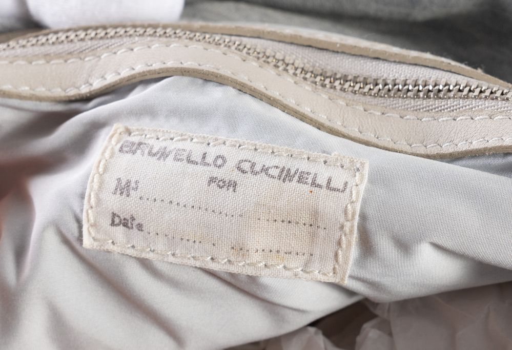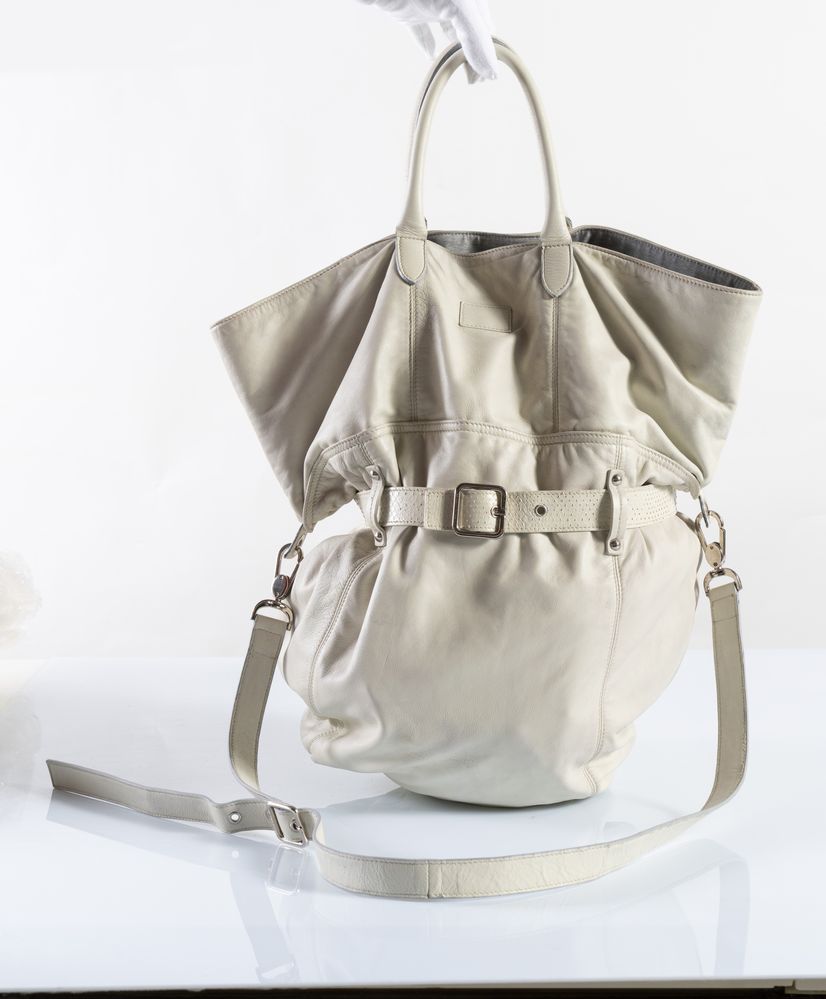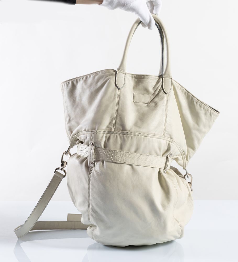 BRUNELLO CUCINELLI Borsa da spalla in nappa beige. Cinturino decorativo sulla parte frontale. Tracolla removibile e regolabile. Interno in cachemire grigio. Cm 50x40x5; altezza con tracolla cm 80. Reca marchio Brunello Cucinelli.