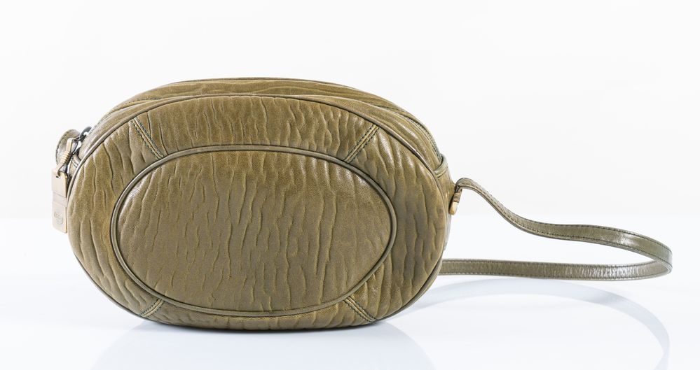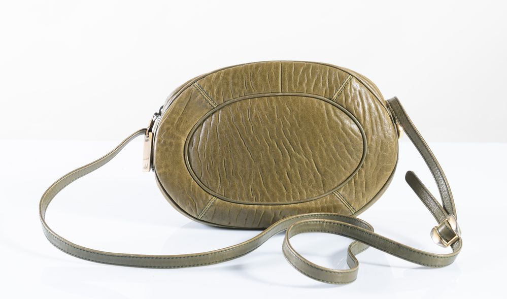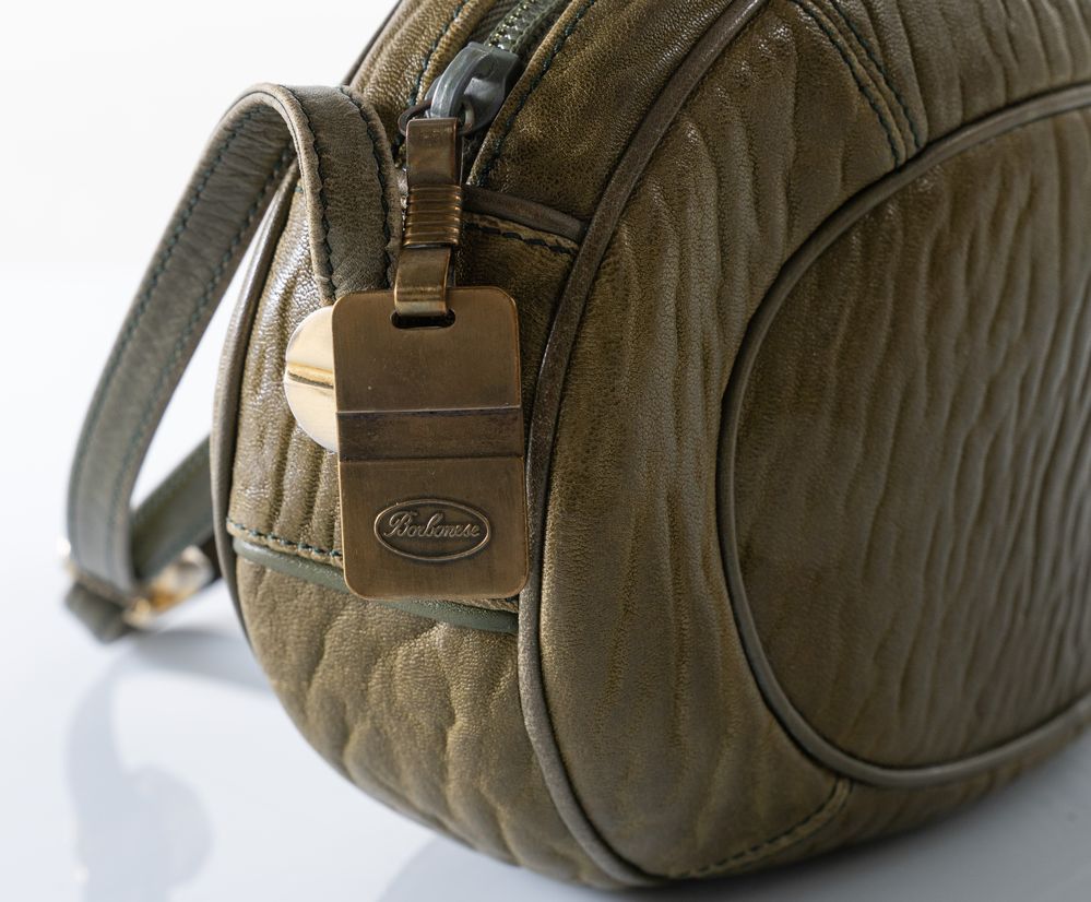 BORBONESE Borsa a tracolla in pelle verde. Cm 16x25x6: altezza con tracolla cm 70. Reca marchio Borbonese e Redwall Made in Italy.