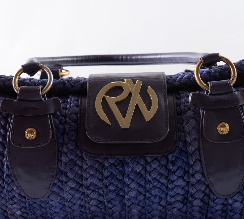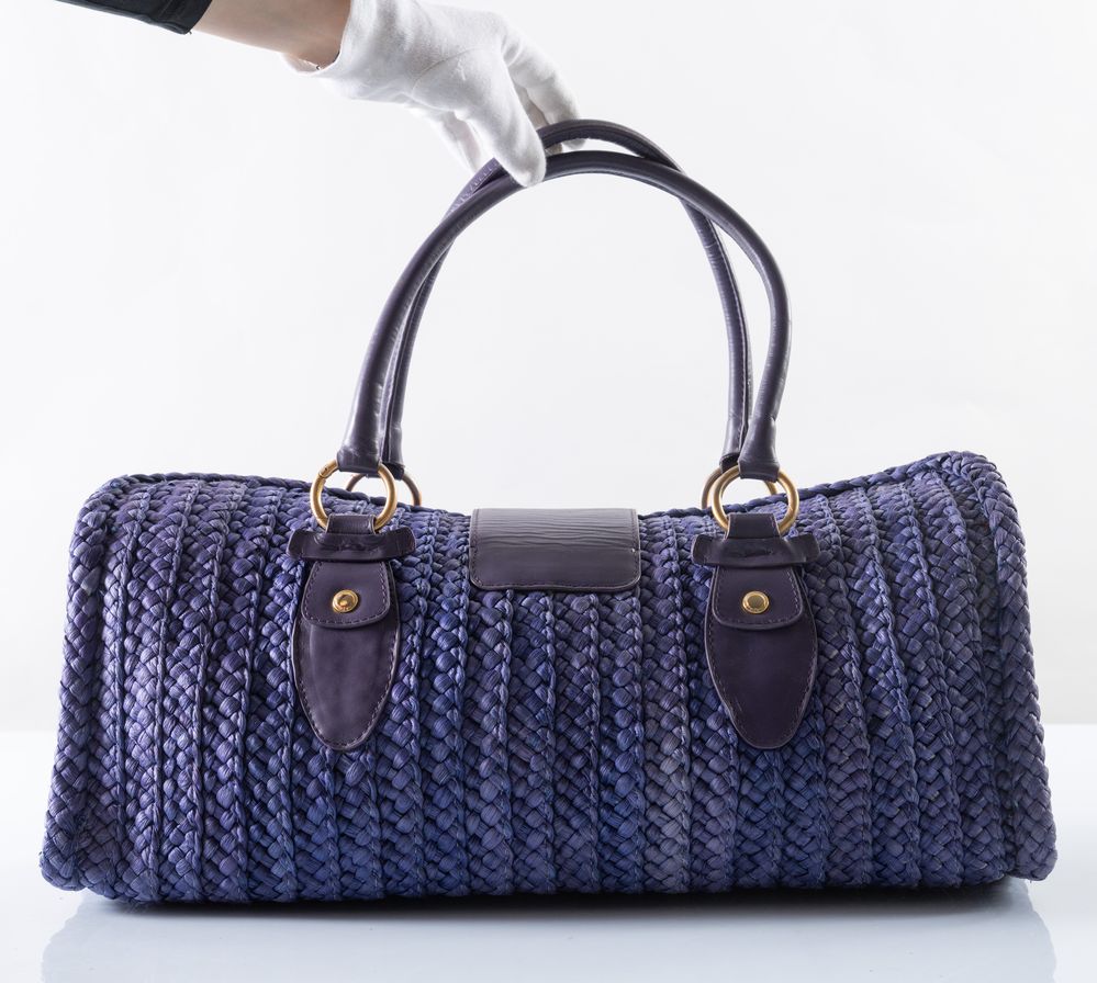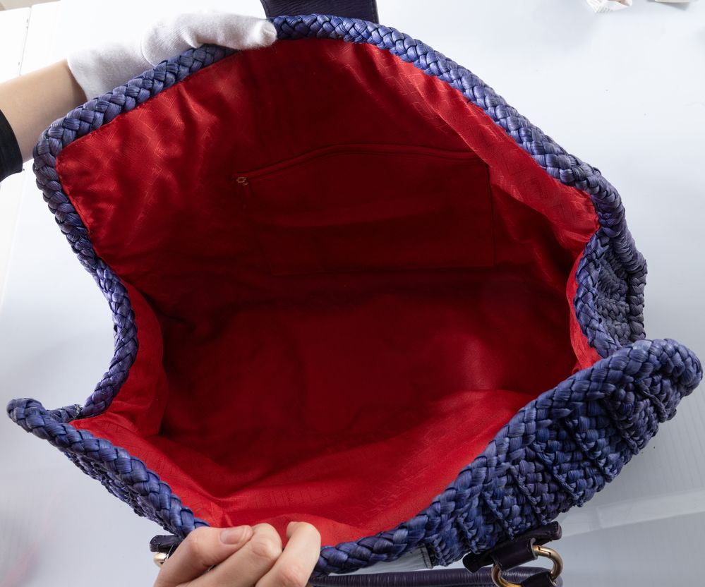 REDWALL Borsa a spalla in rafia intrecciata viola. Manico con inserti in pelle e dettagli in metallo dorato. Interno in tessuto rosso. Cm 22x53x15; altezza con manico cm 45. Reca marchio Redwall,