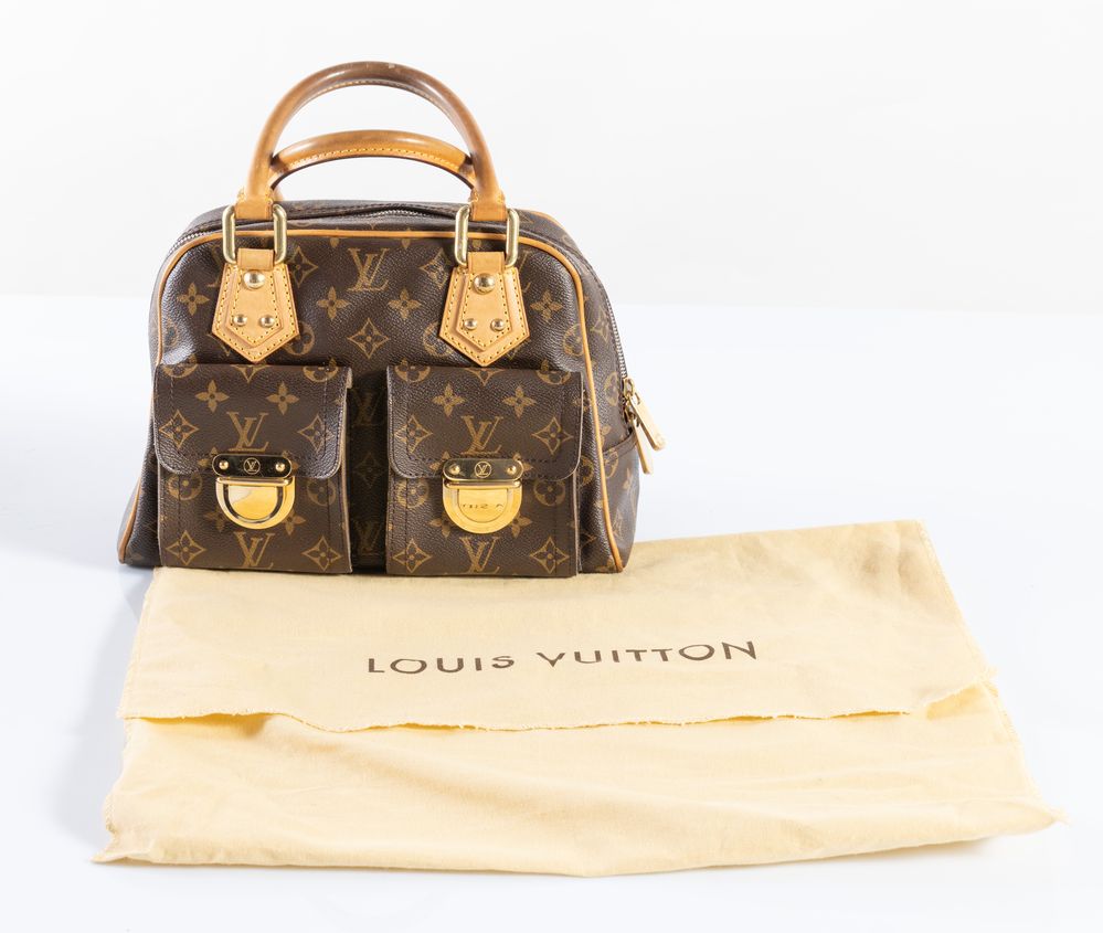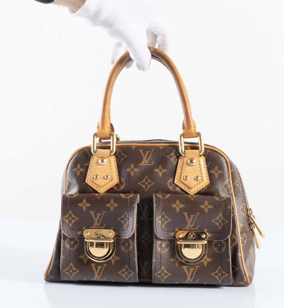 LOUIS VUITTON Borsa a mano modello Manhattan in tela monogram con manici e rifiniture in pelle. Reca due tasche sulla parte anteriore. Dettagli in metallo dorato. Cm 20x30x14; altezza con manici 34 cm. Corredata di dustbag e codice di riferimento prodotto VI0076.