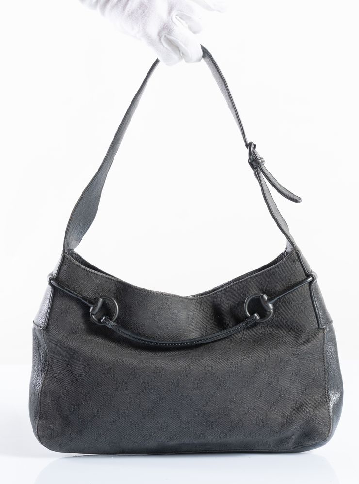 GUCCI Borsa a spalla in tela nera GG. Inserti in pelle nera e metallo nero....