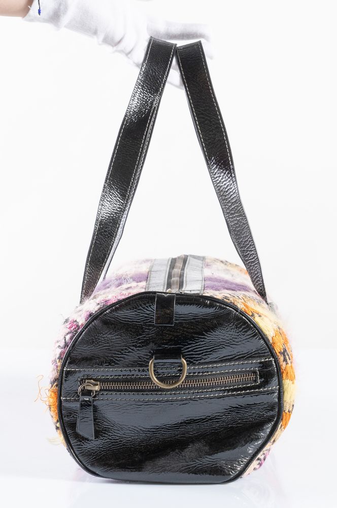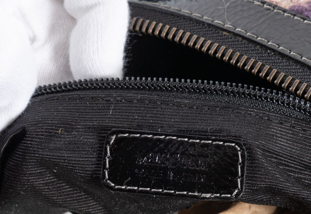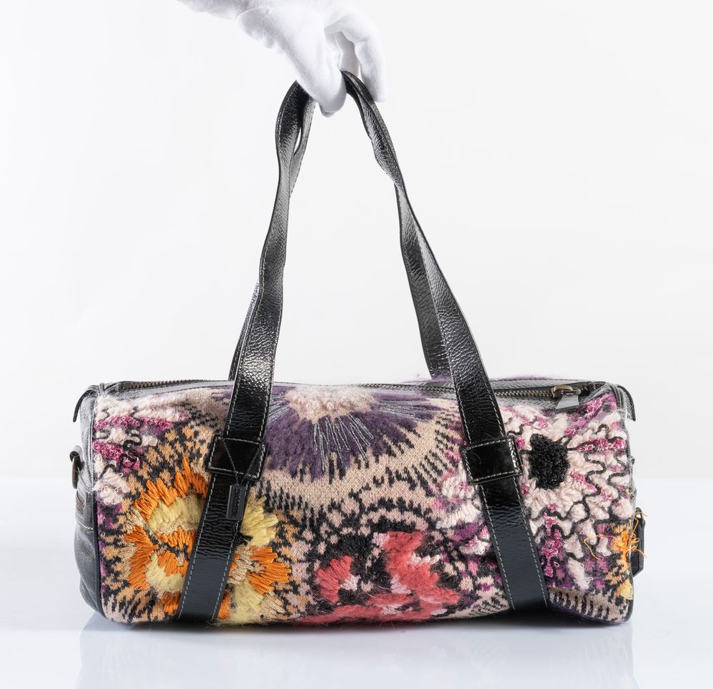 MISSONI Borsa a bauletto in tessuto a fantasia con dettagli in pelle nera. Cm 17x40x20; altezza con manici cm 43. Reca marchio Missoni.