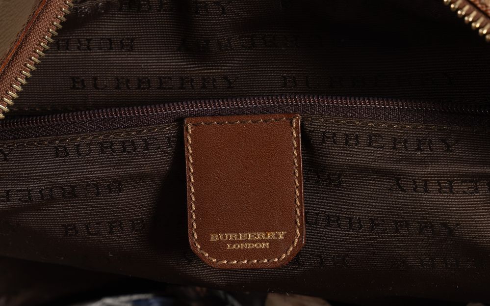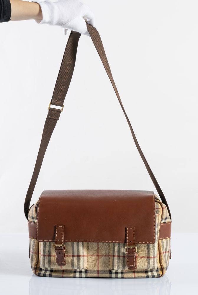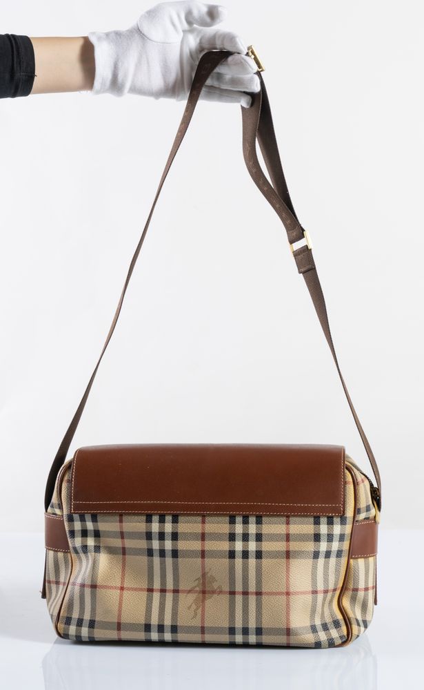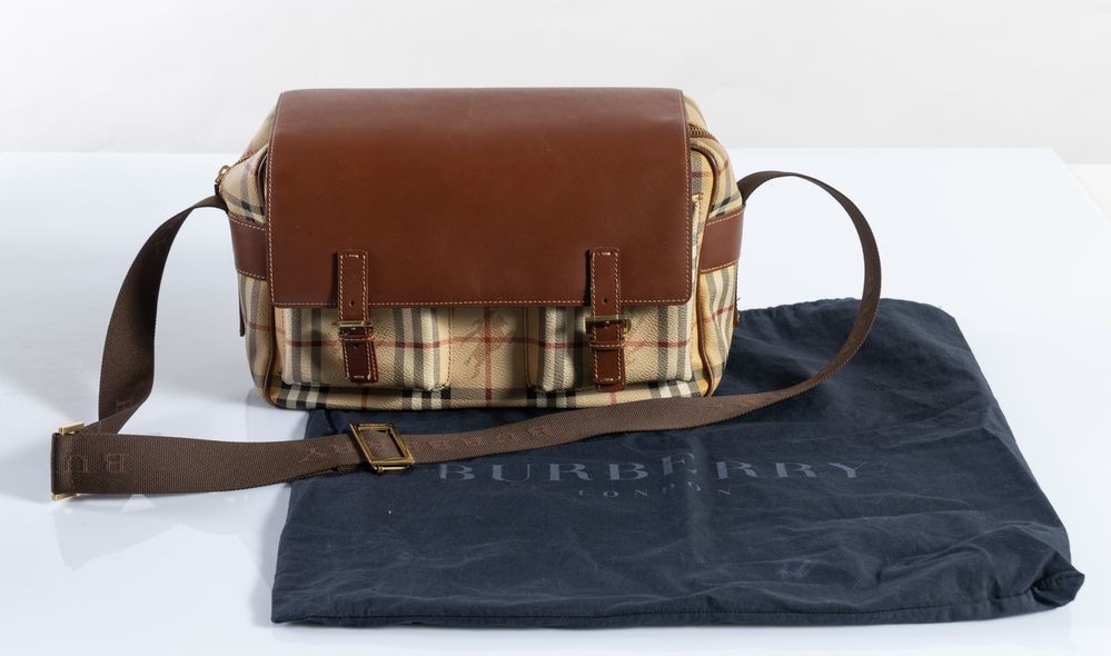BURBERRY Borsa a tracolla con doppia tasca sulla parte anteriore. Tracolla regolabile. Cm 21x34x15; altezza con tracolla 57. Reca marchio Burberry London. Corredata di dustbag.