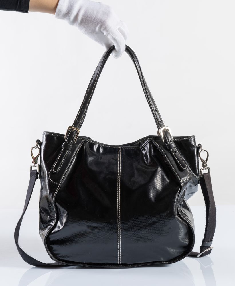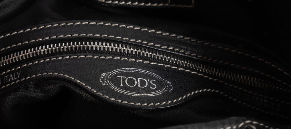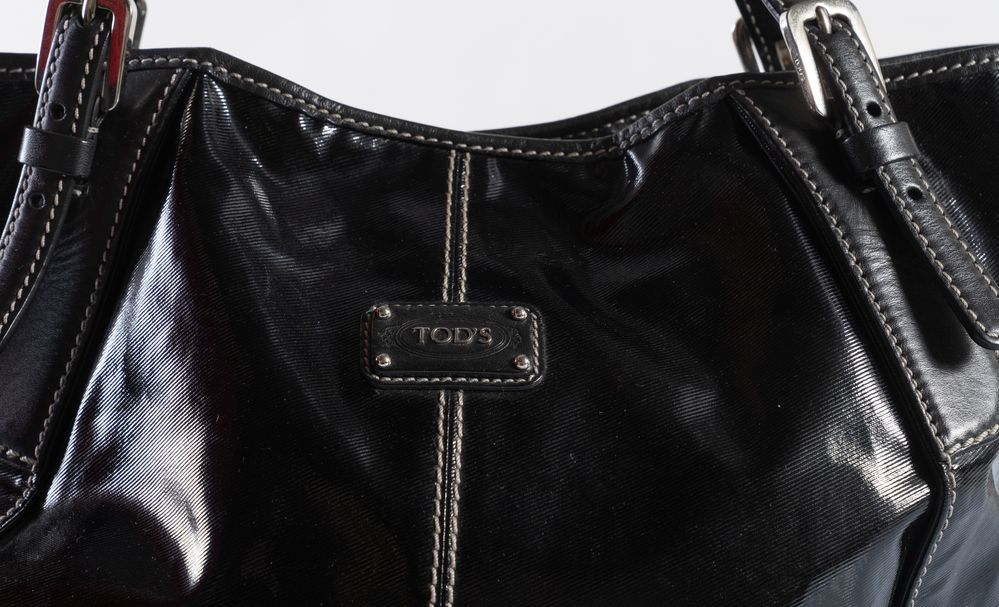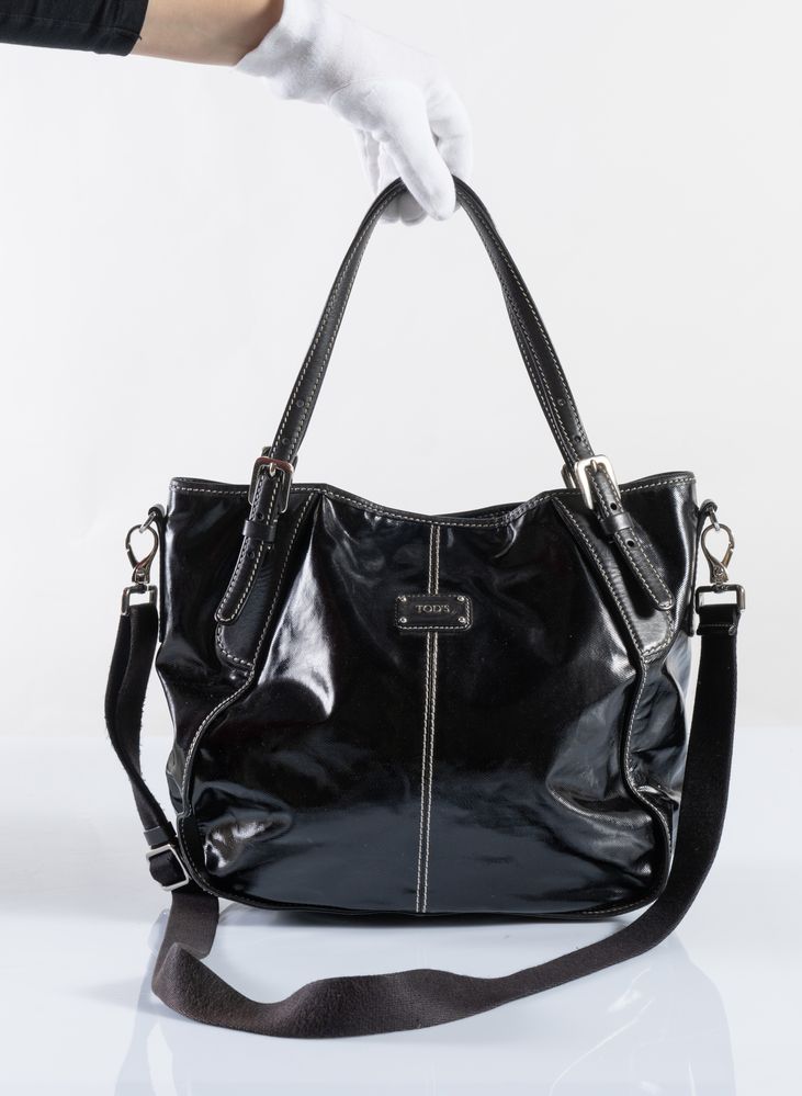TOD'S Borsa in vinile nero con cuciture bianche e finiture in metallo argentato e pelle. Cm 25x38x14. Altezza con manici cm 45. Tracolla removibile. All'interno reca tre tasche. Reca marchi Tod's, Made in Italy e Genuine Leather.