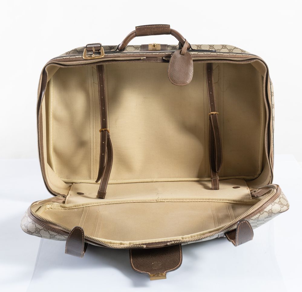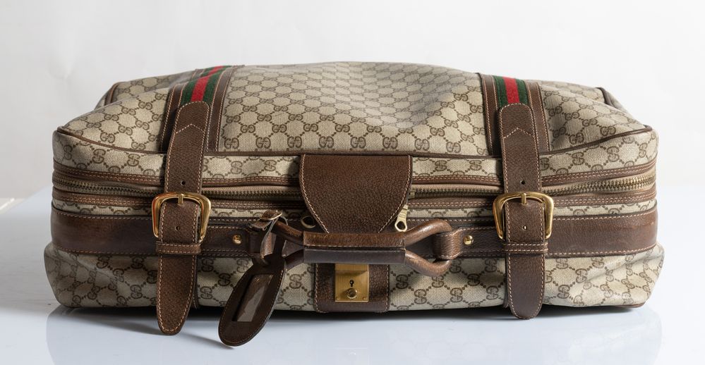 GUCCI Borsa da viaggio in tela monogram con finiture in nastro Web rosso e verde intarsiato. Cm 40x56x17; altezza con manico cm 48. Reca marchi Gucci e GG. (lievi difetti)