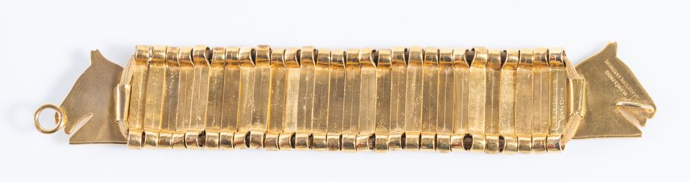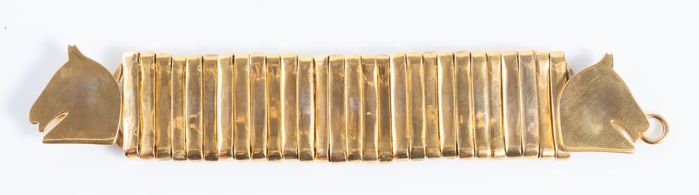 HERMES Raro bracciale semirigido in metallo dorato e chiusura a doppia testa di cavallo. Lunghezza totale da aperto: cm 20. Reca marchio Hermes Paris Bijouterie Fantaisie.