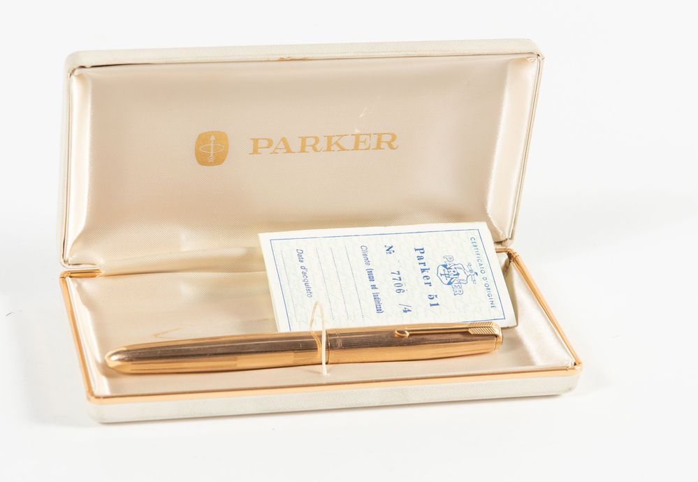 PARKER Penna stilografica modello 51 1/10 12ct Gold. Corredata di scatola originale e certificato d'origine. (Lievi difetti, necessita di revisione)