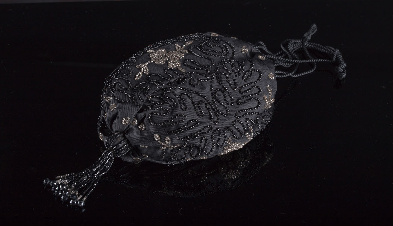 An embroidered black pochette. A pendent tassel and black beads embellish the bag.