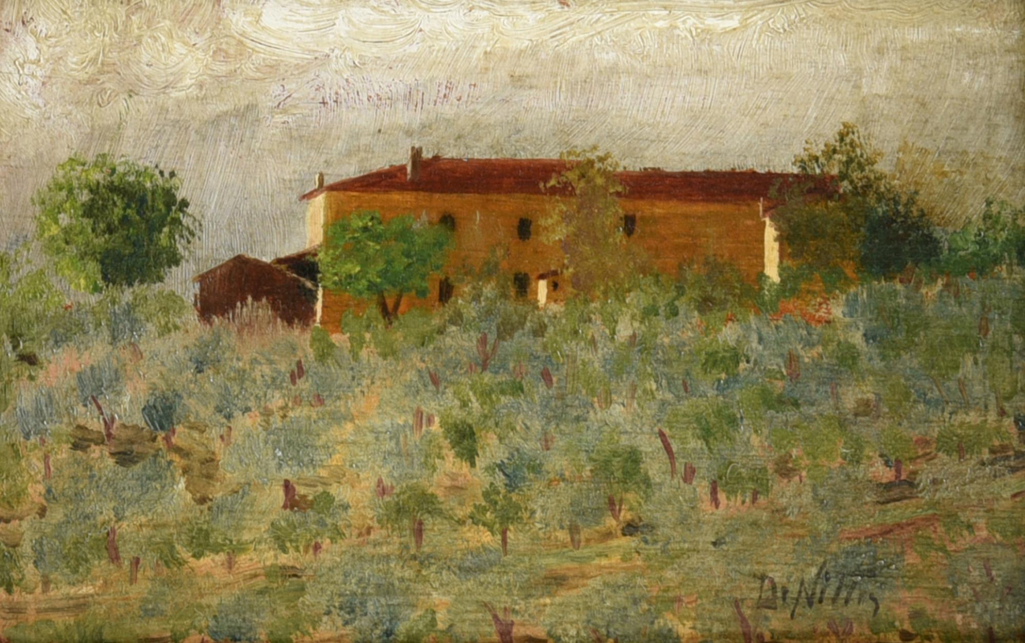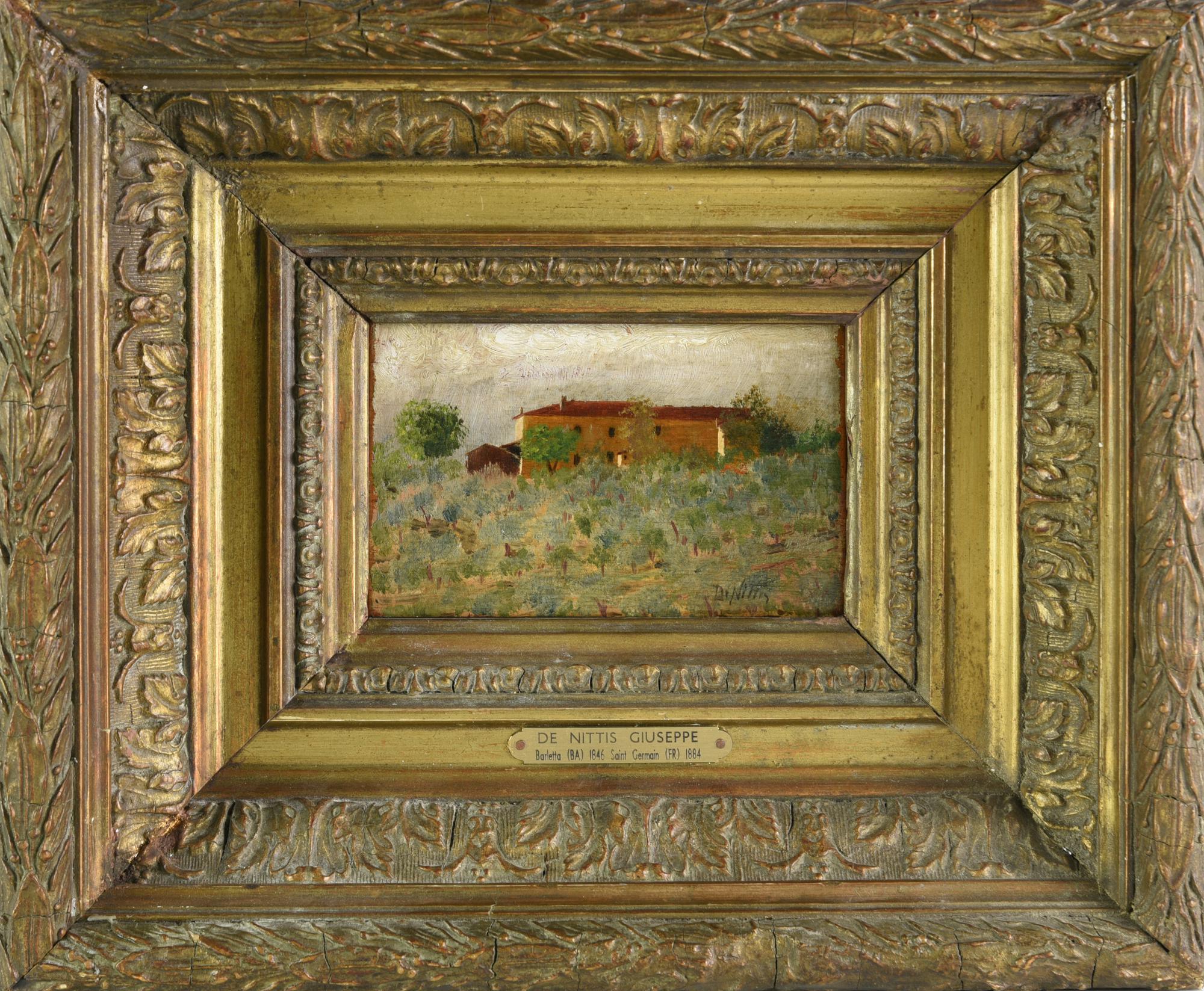 Giuseppe De Nittis PAESAGGIO olio su tavola, cm 8,4x13 circa firma sul retro:...