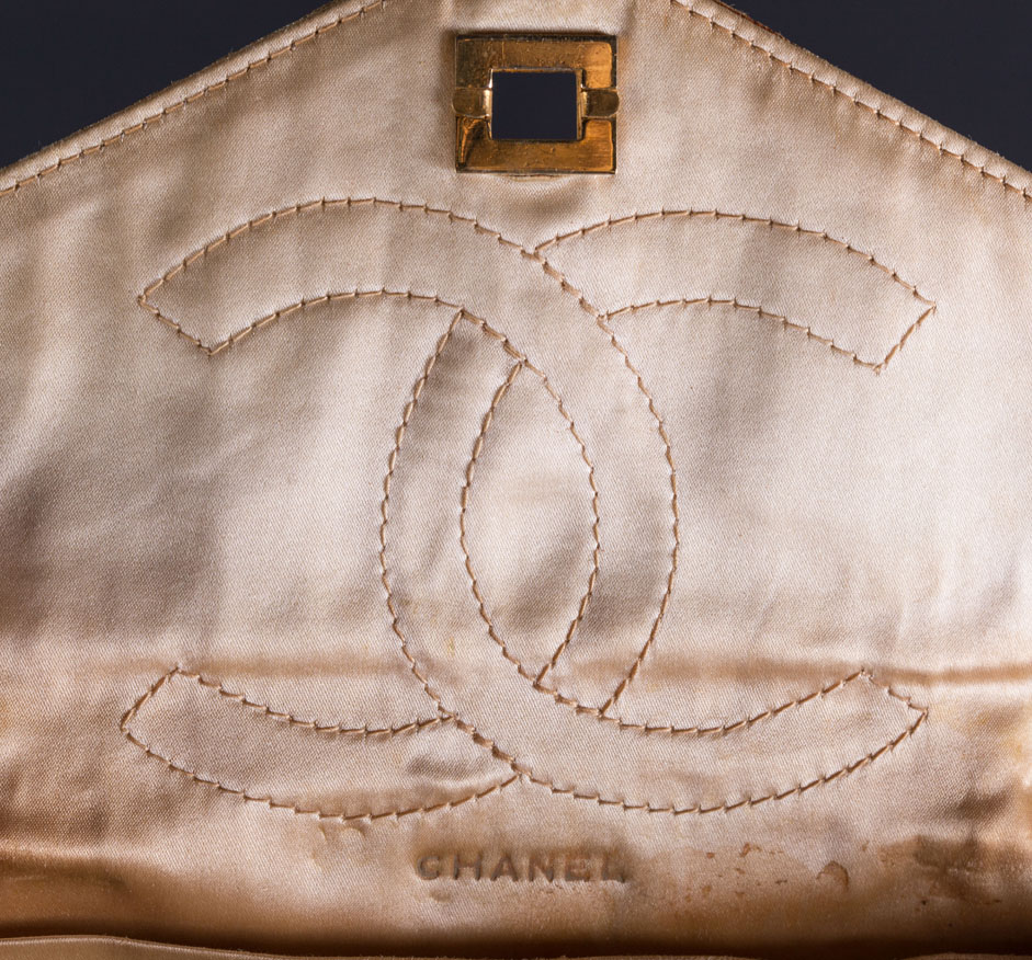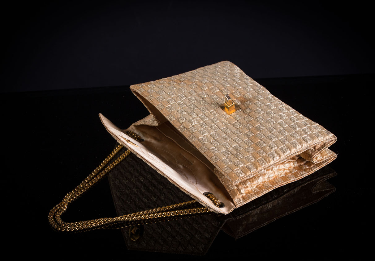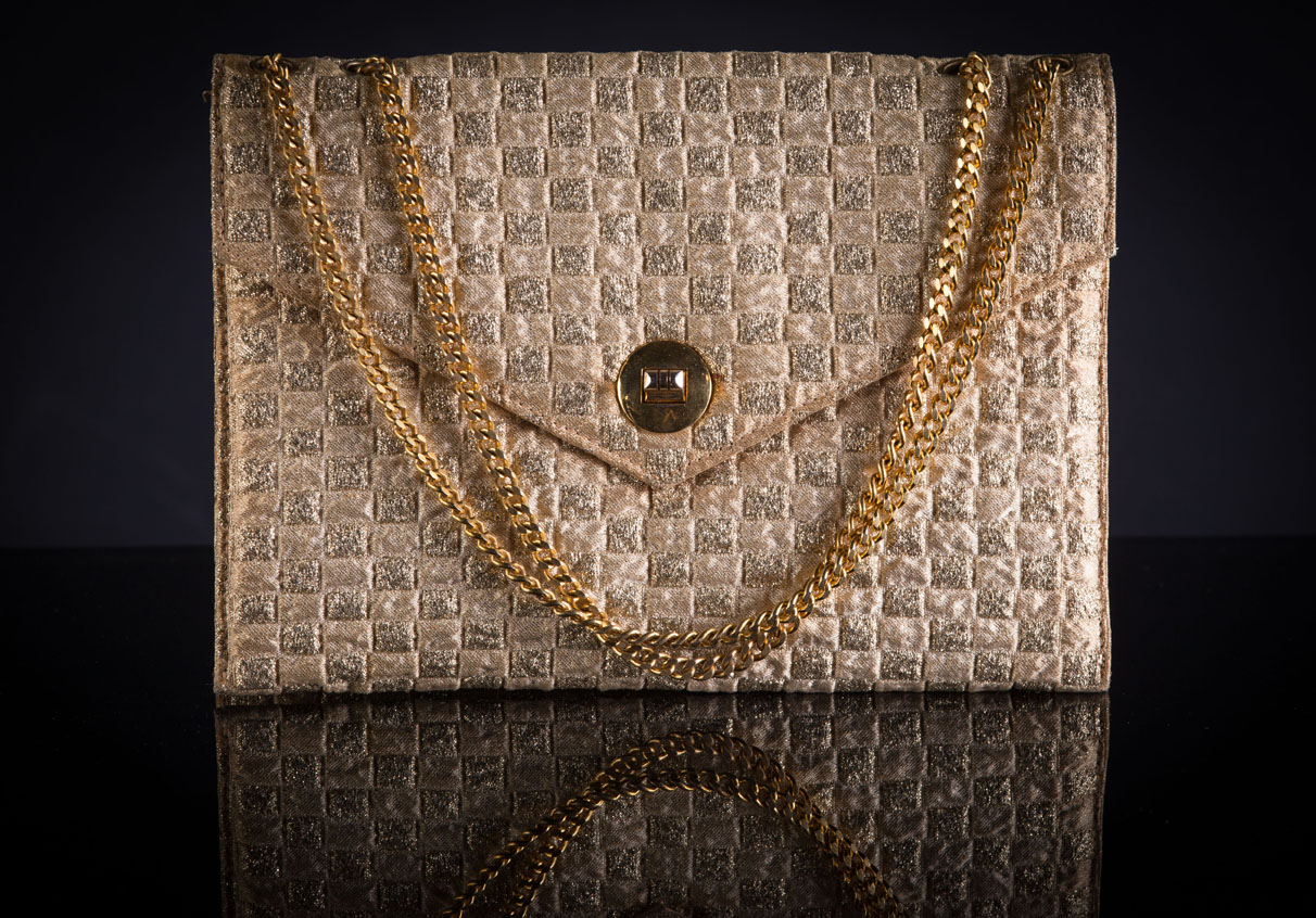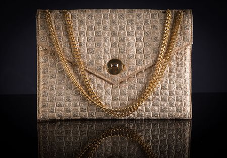 '60sAn elegant envelope handbag, checked pattern in jacquard fabric. A play of light and shadows is created by the alternating beige and gold colours. It presents a double gilt chain shoulder strap, 15 cm long.