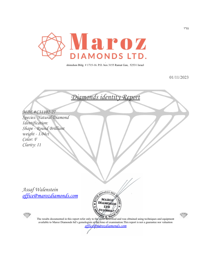 DIAMANTE 1,04 CARATI - COLORE F - PUREZZA I1 - TAGLIO BRILLANTE - CERTIFICATO GEMMOLOGICO MAROZ DIAMONDS LTD MEMBRO ISRAEL DIAMOND EXCHANGE - C31102-27