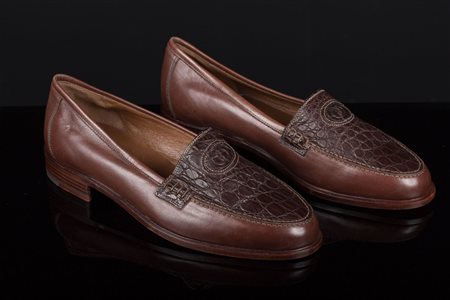 A pair of classic men's brown leather moccasins, unused. The upper part of the shoe, in brown crocodile print leather, presents the Gucci logo impressed in the centre.