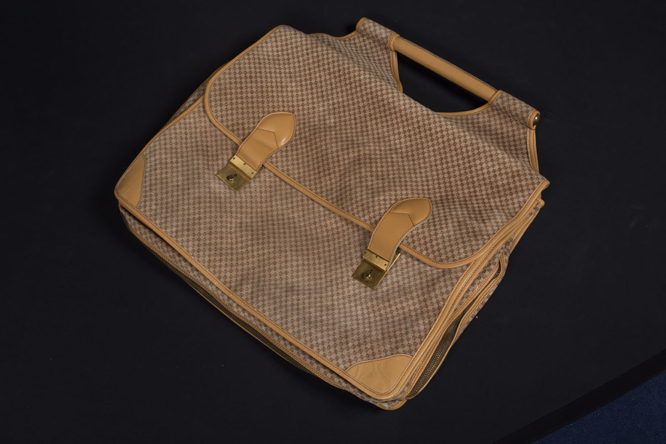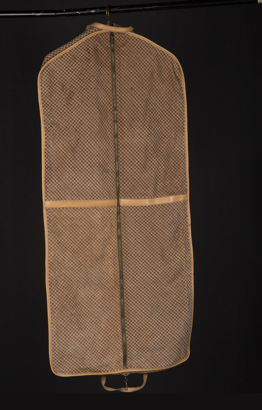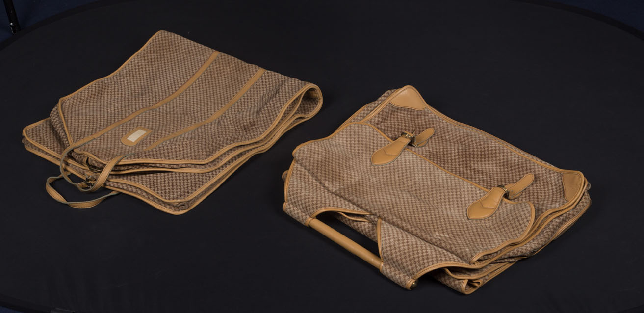 A set of fabric and beige leather garment bags.