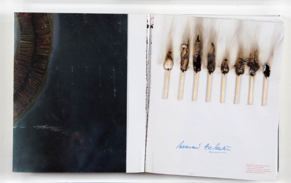 BERNARD AUBERTIN 1934 Senza titolo Fiammiferi bruciati su libro, cm. 28 x 47 Firmato in basso Fotografia dell'artista e l'opera Prov. Collezione Privata