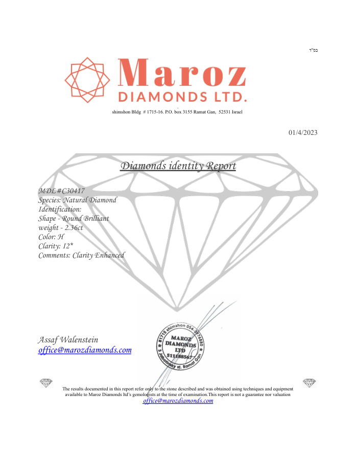 DIAMANTE NATURAL POLISHED 2,36 CARATI COLORE H - PUREZZA I2* - TAGLIO BRILLANTE - CERTIFICATO GEMMOLOGICO MAROZ DIAMONDS LTD MEMBRO ISRAEL DIAMOND EXCHANGE - C30417