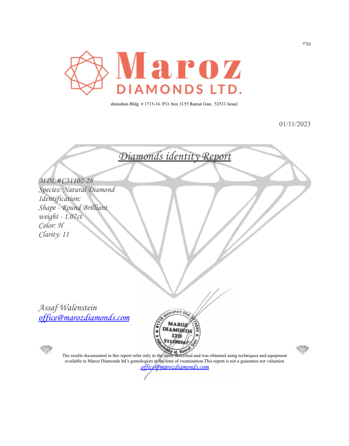 DIAMANTE 1,07 CARATI - COLORE H - PUREZZA I1 - TAGLIO BRILLANTE - CERTIFICATO GEMMOLOGICO MAROZ DIAMONDS LTD MEMBRO ISRAEL DIAMOND EXCHANGE - C31102-28