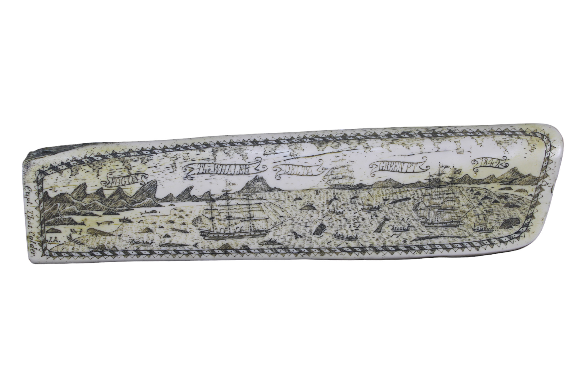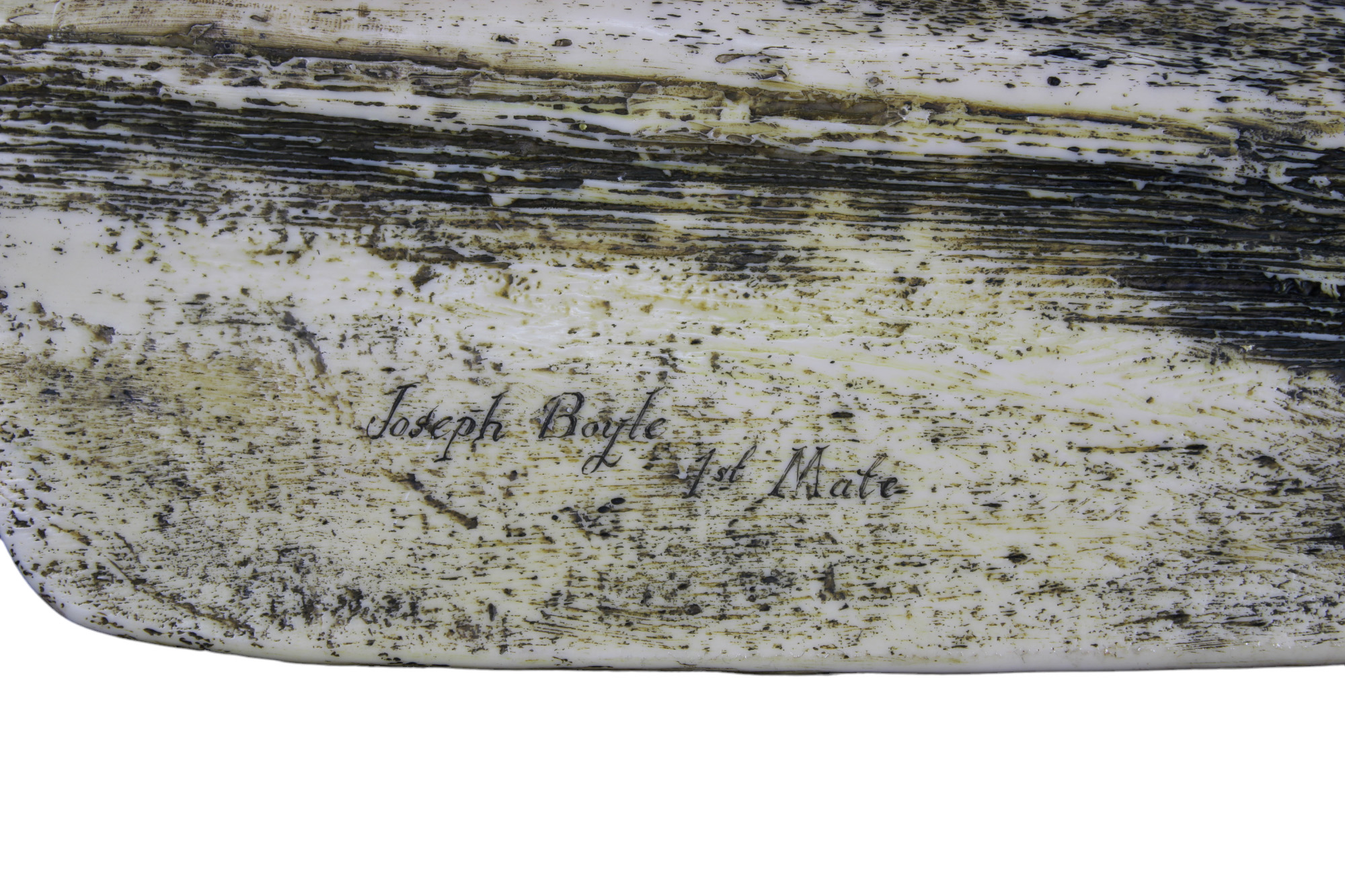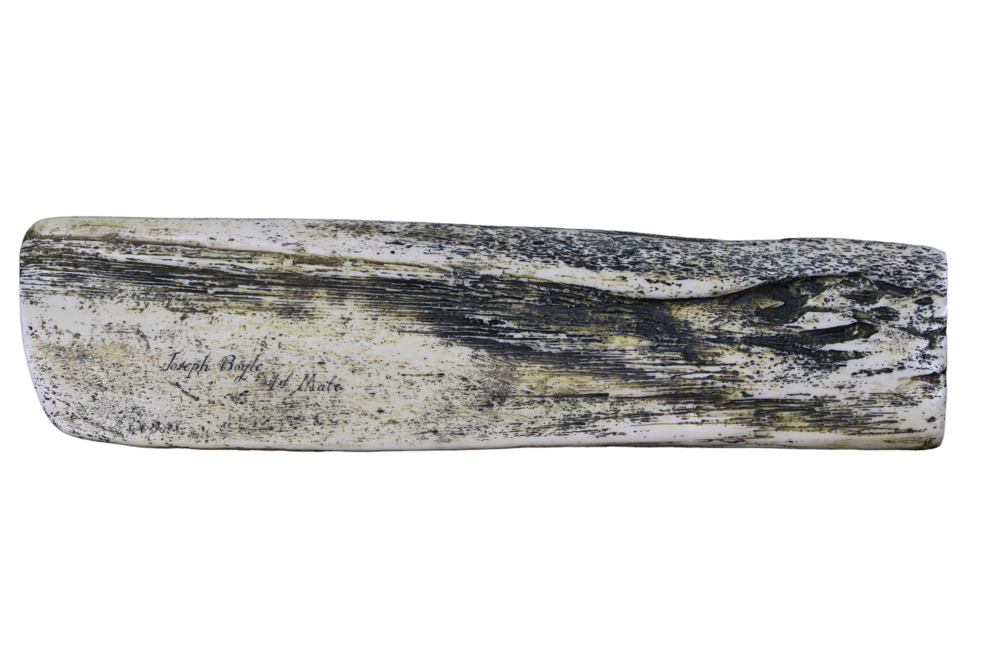 OSSO DI BALENA INCISO raffigurante baleniere firma incisa sul retro 1° ufficiale joseph boyle h cm 42 x 11 x 4