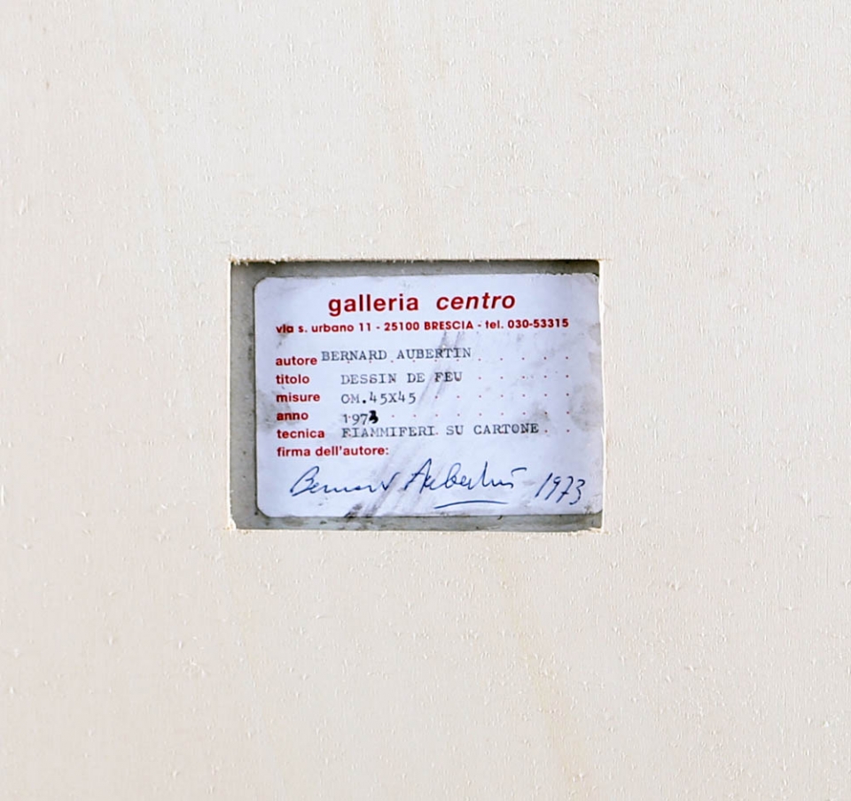 BERNARD AUBERTIN 1934 " Dessin de feu ", 1974 Fiammiferi bruciati applicati su cartone, cm. 45 x 45 Firmato e datato sul retro Autentica dell'artista su fotografia Etichetta Galleria Centro Brescia, sul retro Prov. Collezione Privata