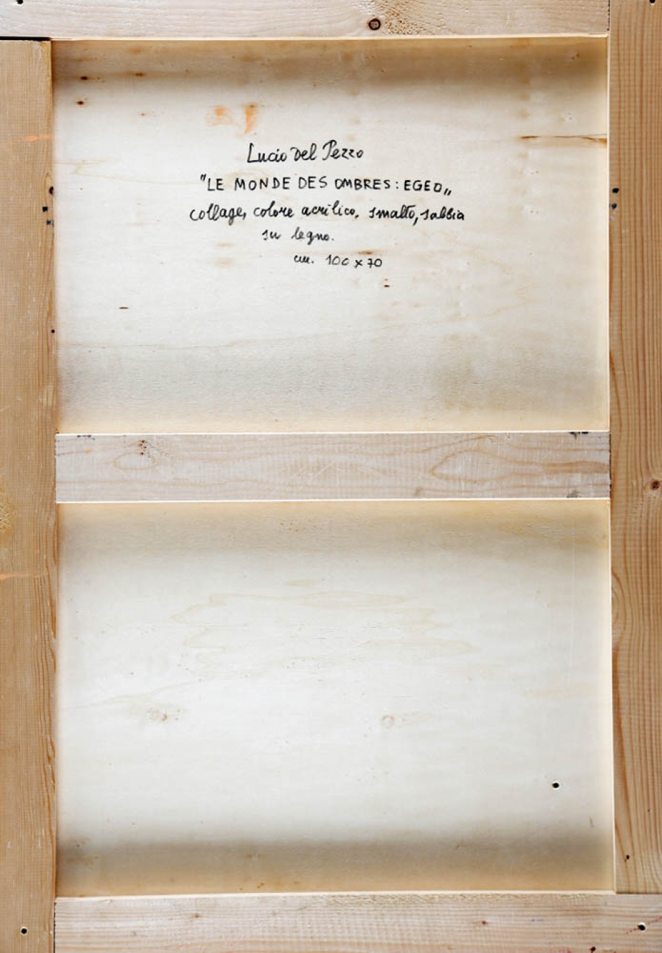LUCIO DEL PEZZO 1933 " Le monde des ombres: Egeo " Collage, acrilico e smalto su legno, cm. 100 x 70 Firmato sul retro Autentica dell'artista su fotografia Archivio Galleria Vinciana n. 07385 Prov. Collezione Privata