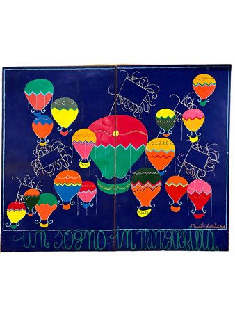 MAURILIO CATALANO acrilico su compensato Opera unica composta da due pannelli raffigurante mongolfiere h cm 280 x 340