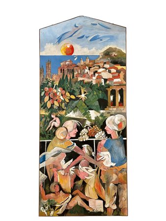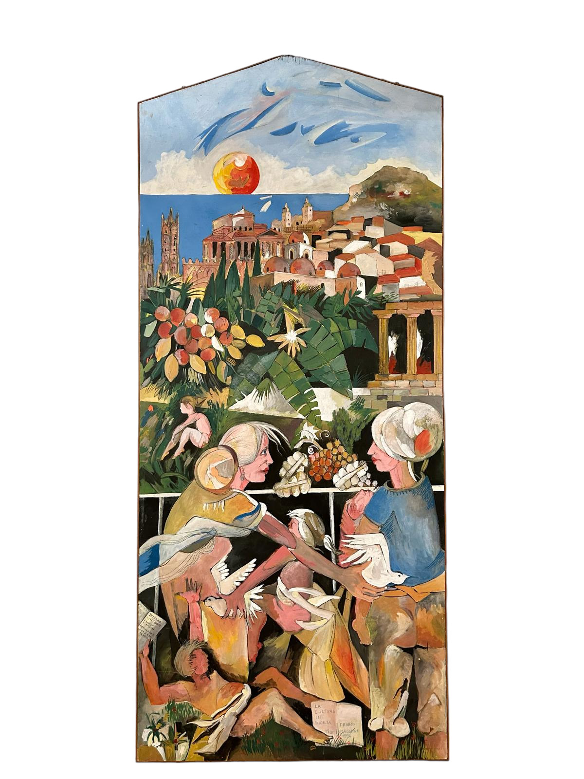 FRANCO MONTEMAGGIORE grande pannello dipinto Titolo La cultura in Sicilia h cm 303 x 132