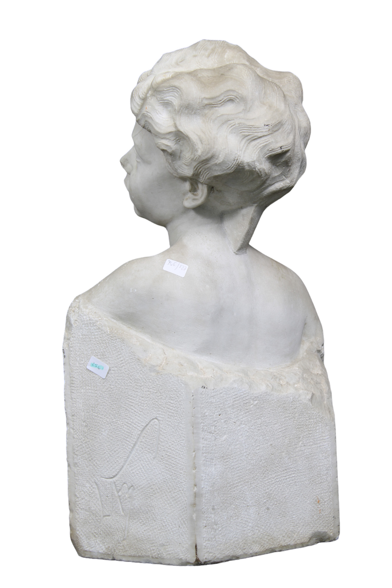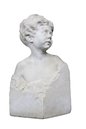 SCULTURA in marmo bianco di Carrara raffigurante mezzo busto di fanciullo, sulla base posteriore reca monogramma non decifrabile maestranze italiane XIX/XX secolo h cm 62 x 38 x 29