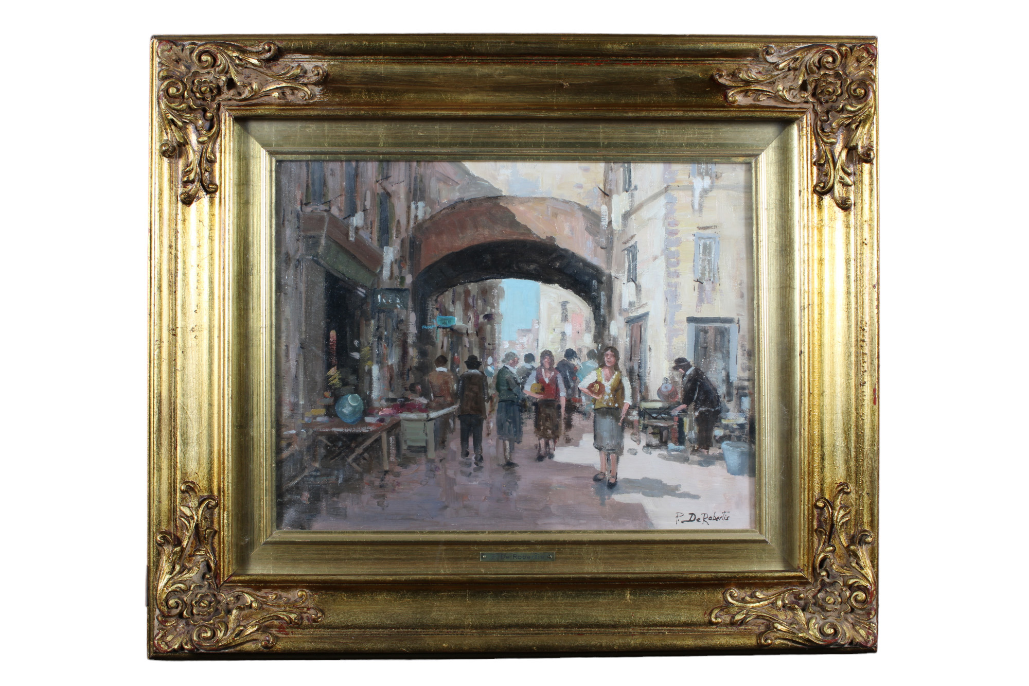 DE ROBERTI olio su tela Mercato, certificato sul retro h cm 40 x 50