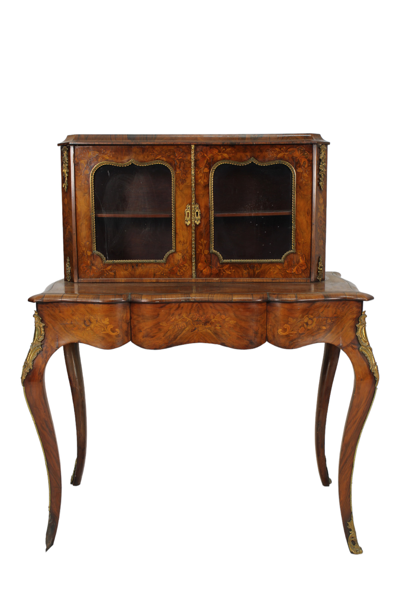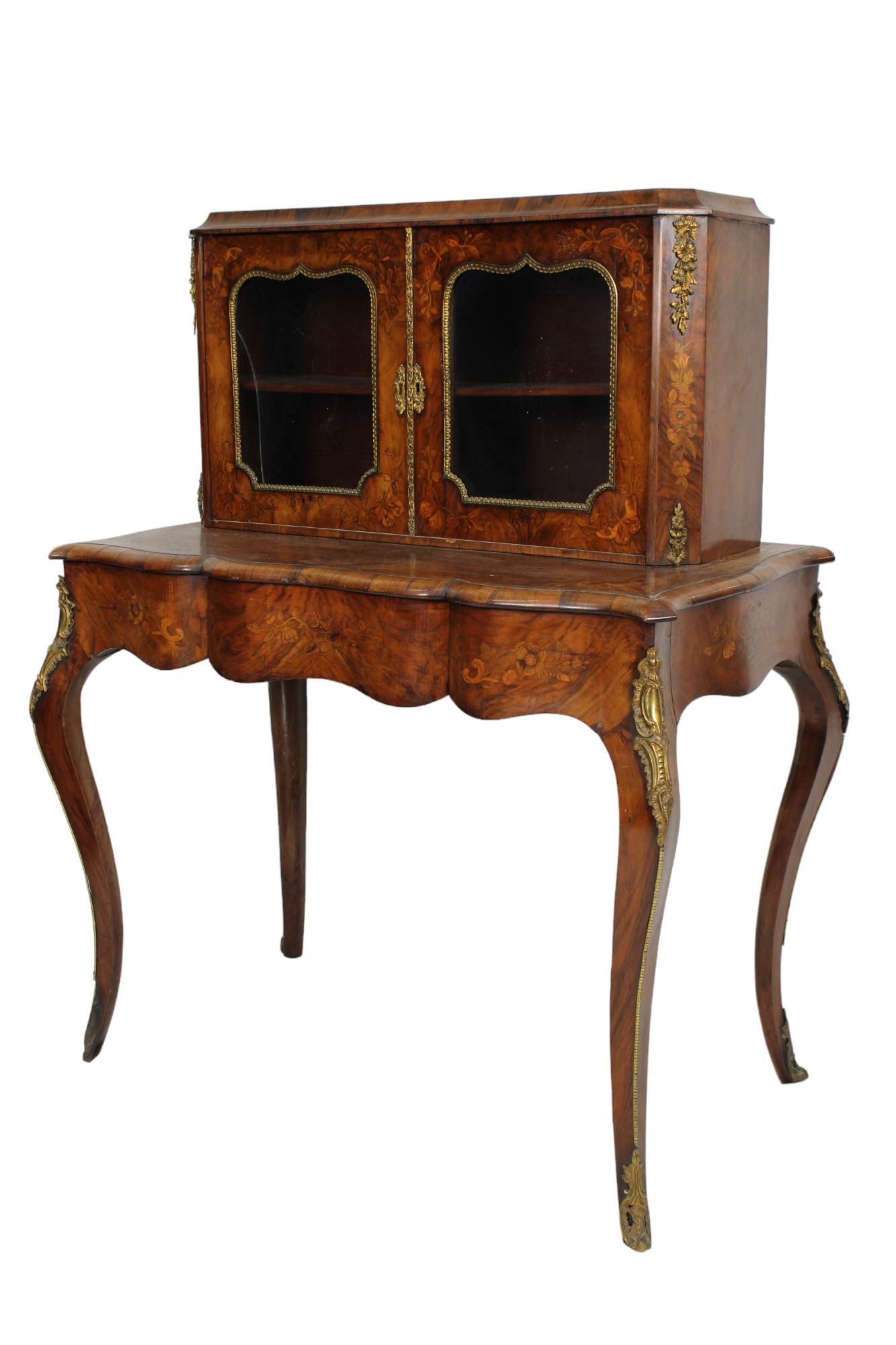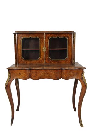 SCRITTOIO CON ALZATA E VETRINA in radica di noce riccamente intarsiato in varie essenze di legno e applicazioni in bronzo dorato Inghilterra XIX secolo h cm 121,5 x 95 x 57