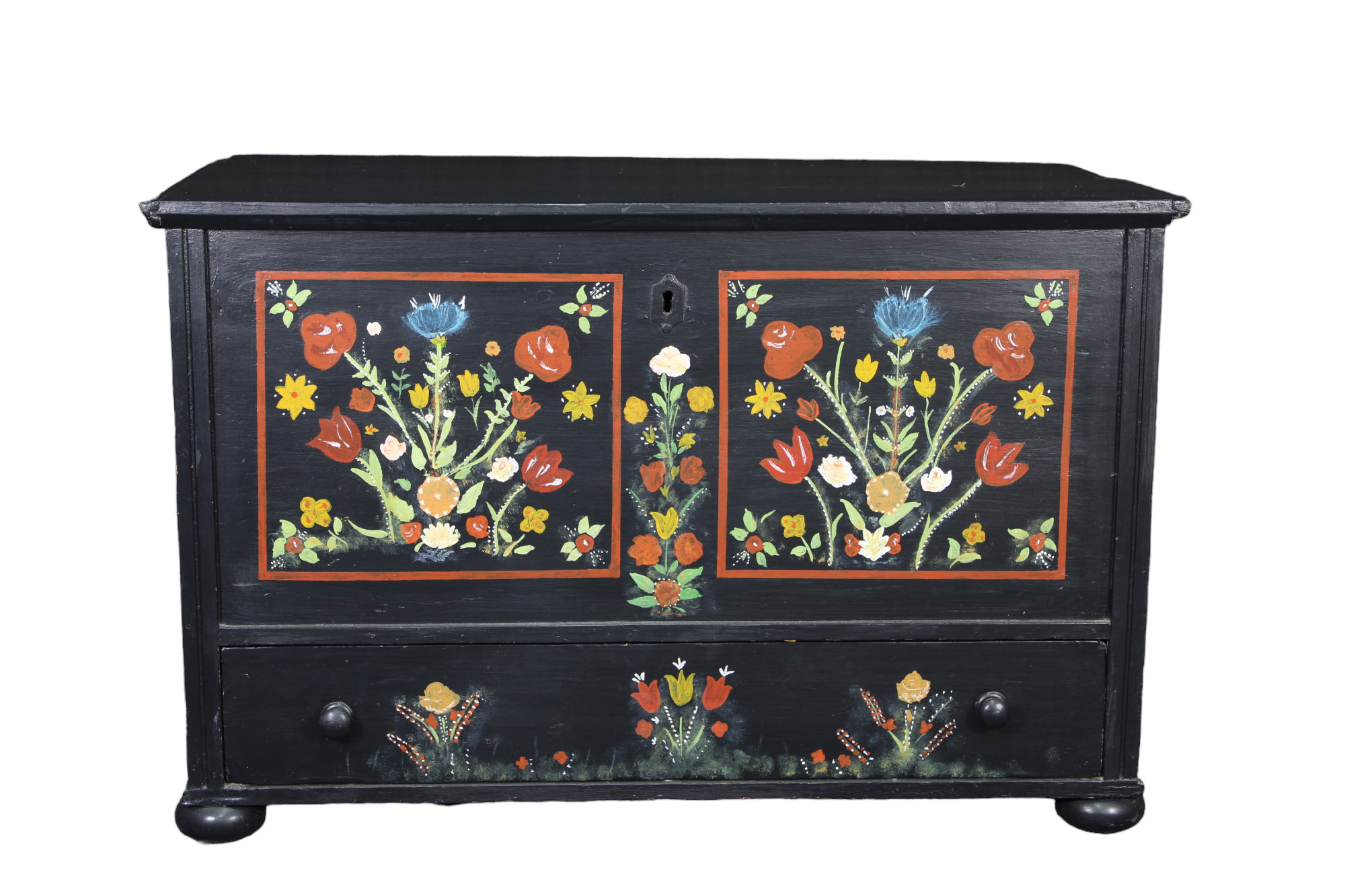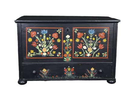 CASSAPANCA con cassetto in legno laccato e dipinto a motivi floreali manifattura tirolese XIX secolo h cm 80 x 123,5 x 60,5