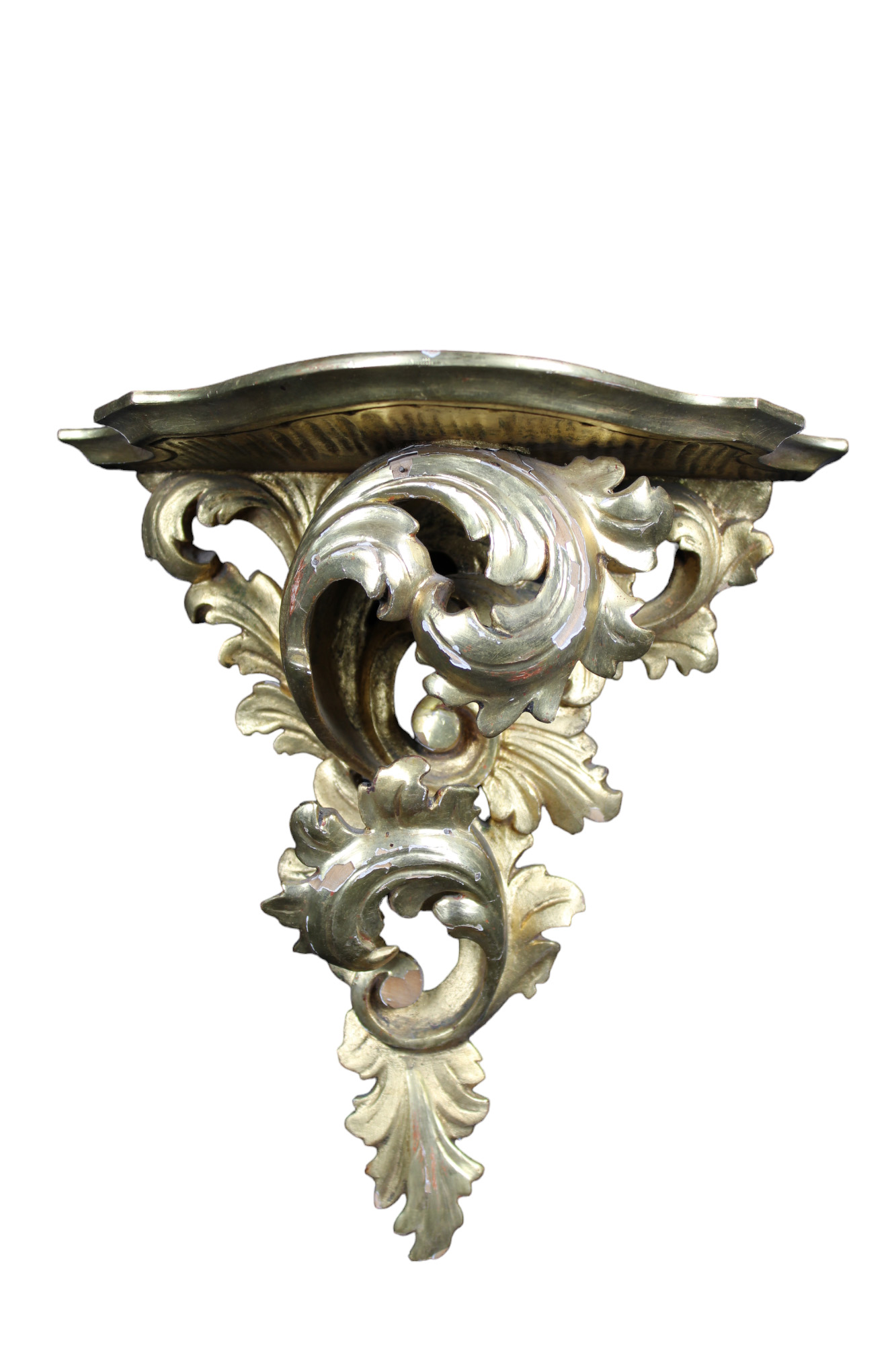 MENSOLA in legno riccamente scolpita a motivi fogliacei e dorata a oro zecchino Italia XIX secolo h cm 29 x 27 x 15