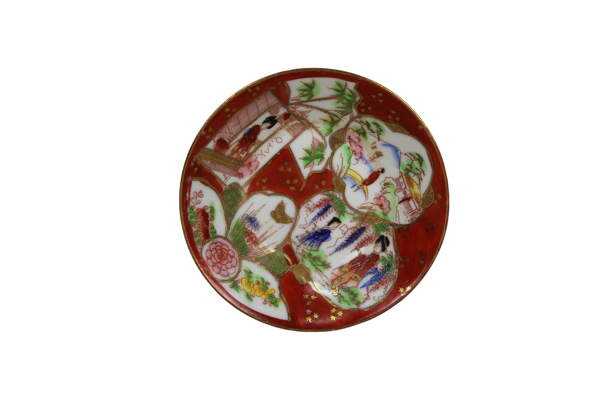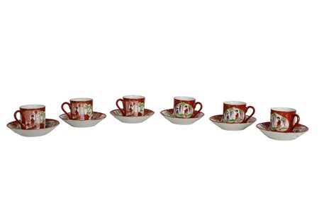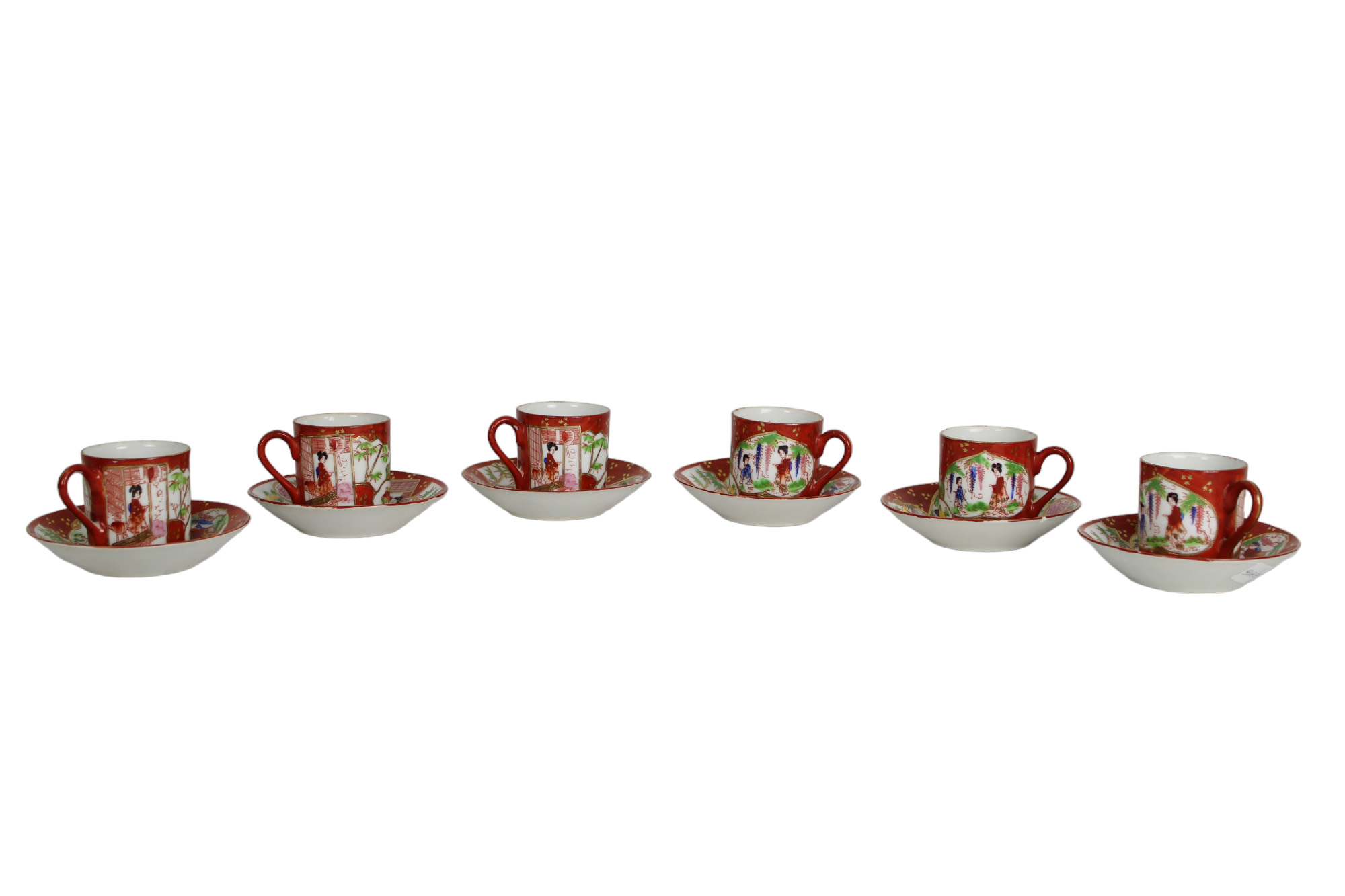 LOTTO DI 6 TAZZINE CON PIATTINI in porcellana decorata a motivi orientali manifattura Cina XX secolo h cm 7 x 10,5