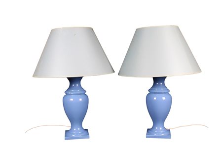 COPPIA LUMI in porcellana con paralumi in stoffa Italia XX secolo h cm 66 x 50