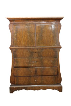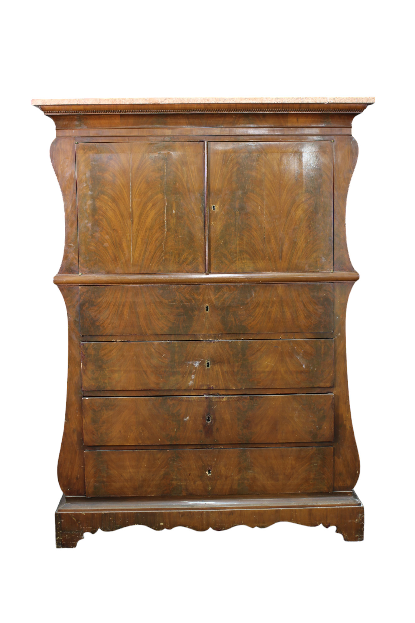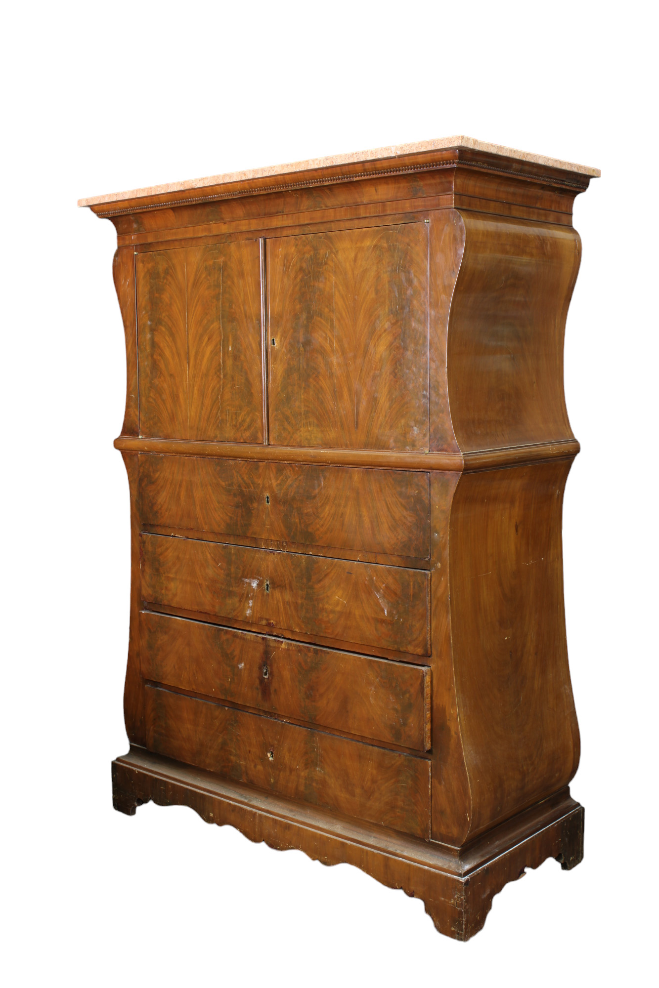 ELEGANTE CHIFFONIER A CHITARRA in piuma di mogano, quattro cassetti e due sportelli marmo breccia francese Sicilia 1820-1830 circa h cm 179 x 131 x 59