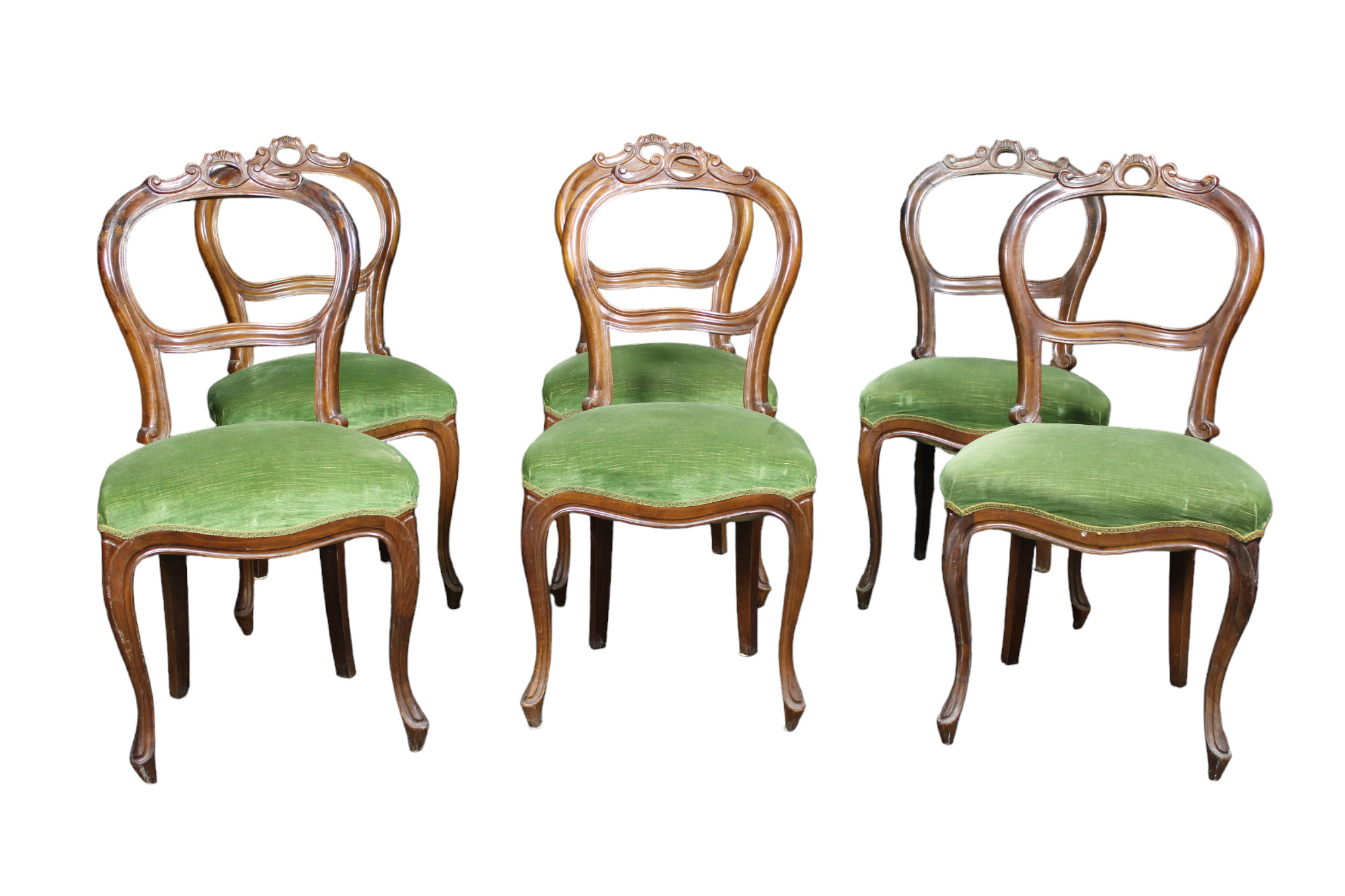 LOTTO DI 6 SEDIE in noce scolpite con seduta in tessuto verde Sicilia XIX secolo h cm 90 x 47 x 37