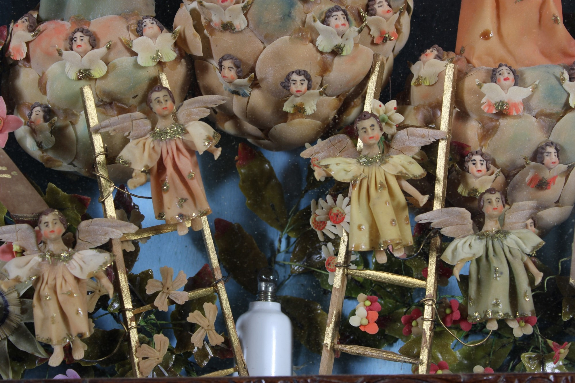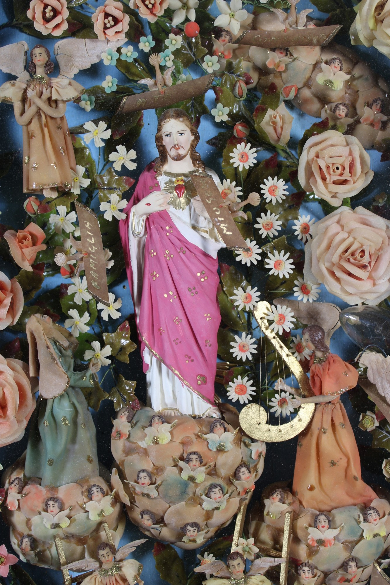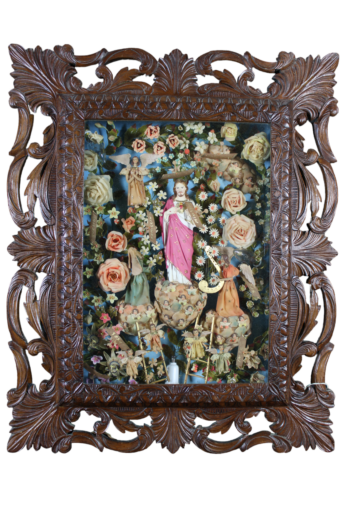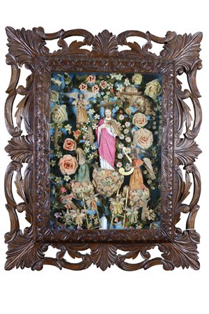 ALTAROLO raffigurante Cuore di Gesù con una composizione floreale e angeli realizzato in diversi materiali tra cui cera, seta e gesso scagliola dentro teca in legno di noce finemente scolpita e traforata Sicilia XIX secolo h cm 90 x 73
