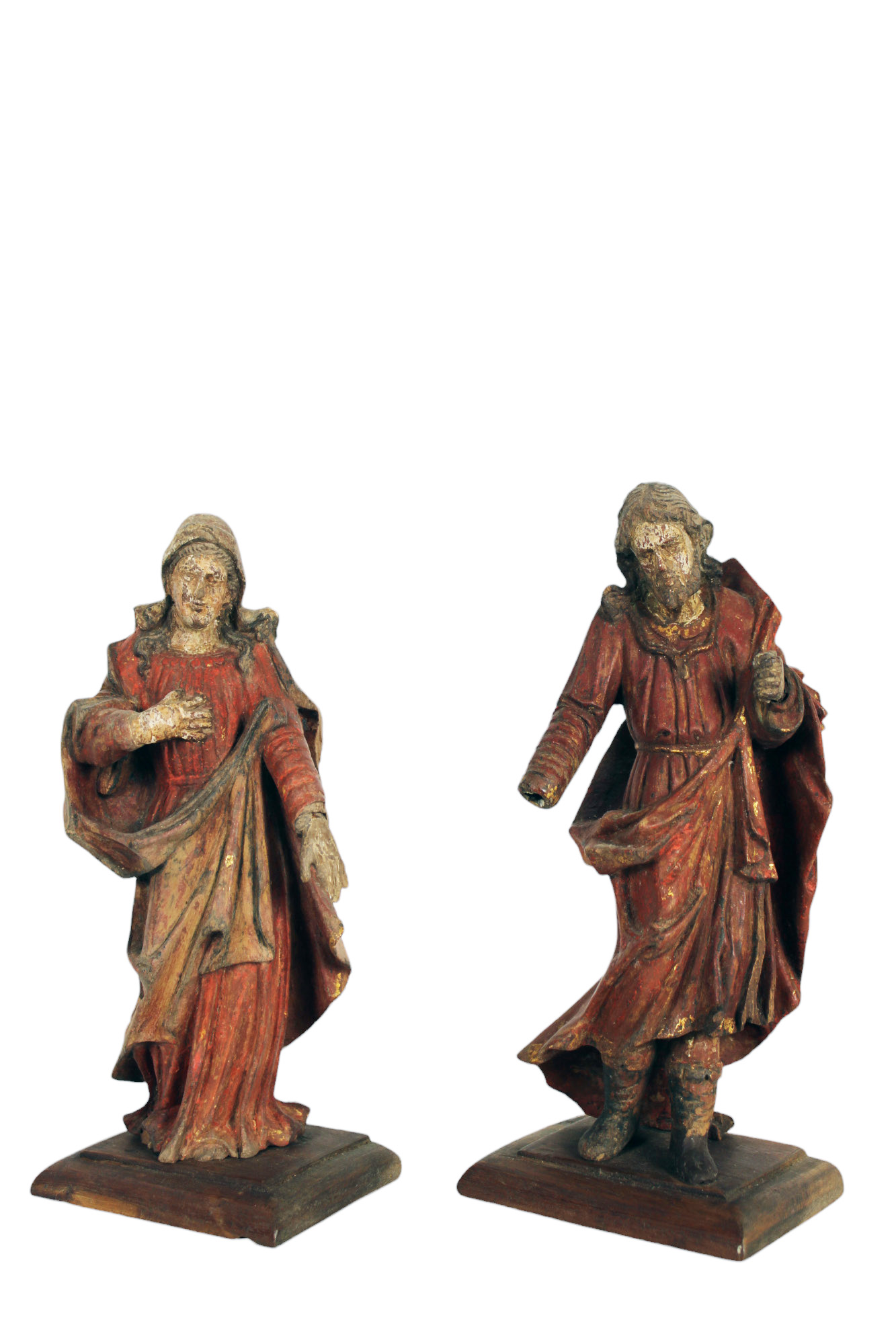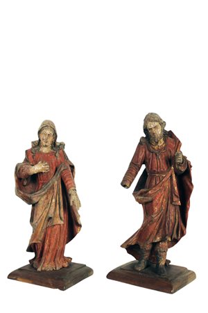 COPPIA DI SCULTURE in legno finemente scolpite e dipinte raffiguranti figure sacre, mancanze Toscana XVIII secolo h cm 24 x 11 x 7,5