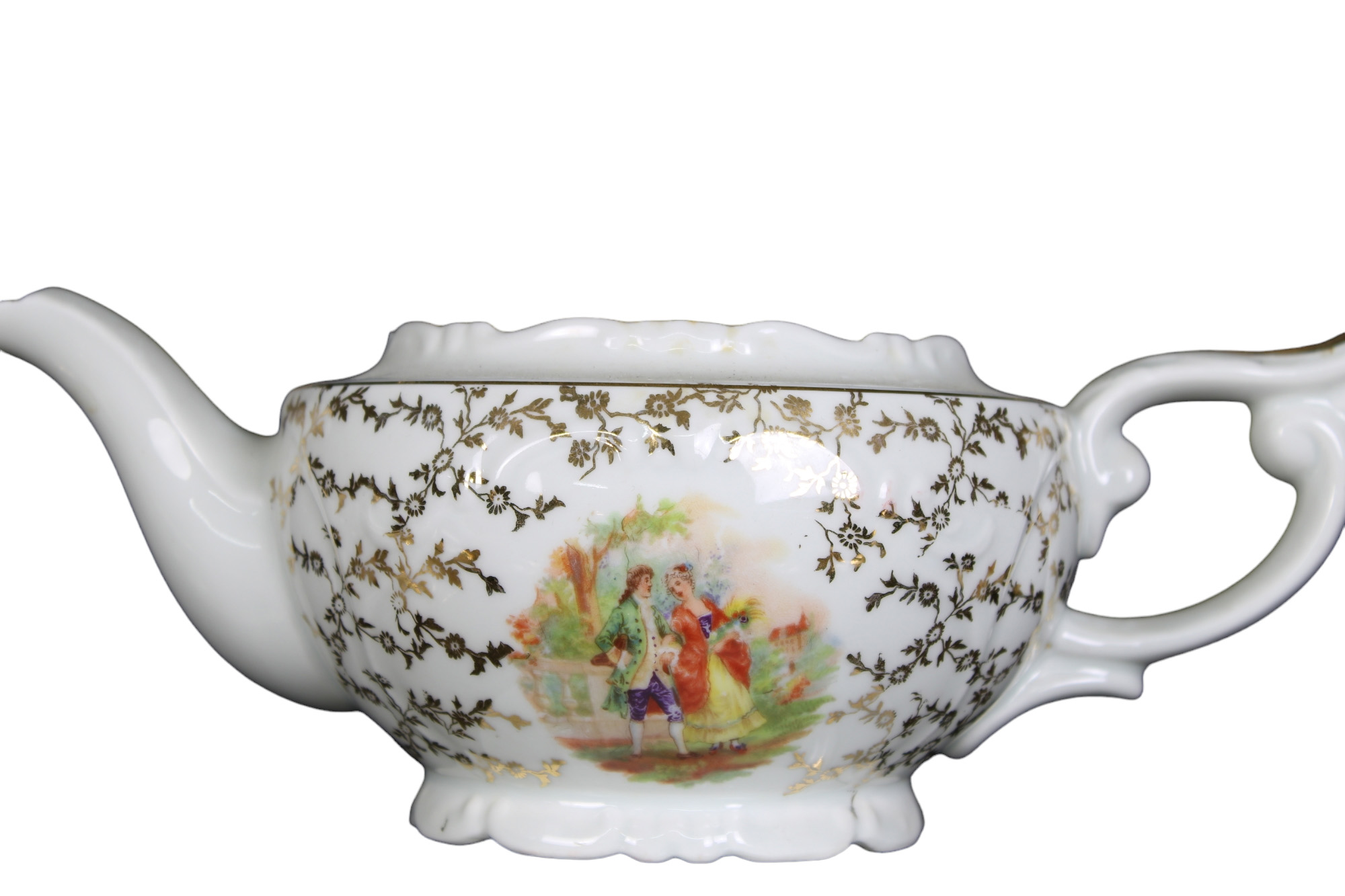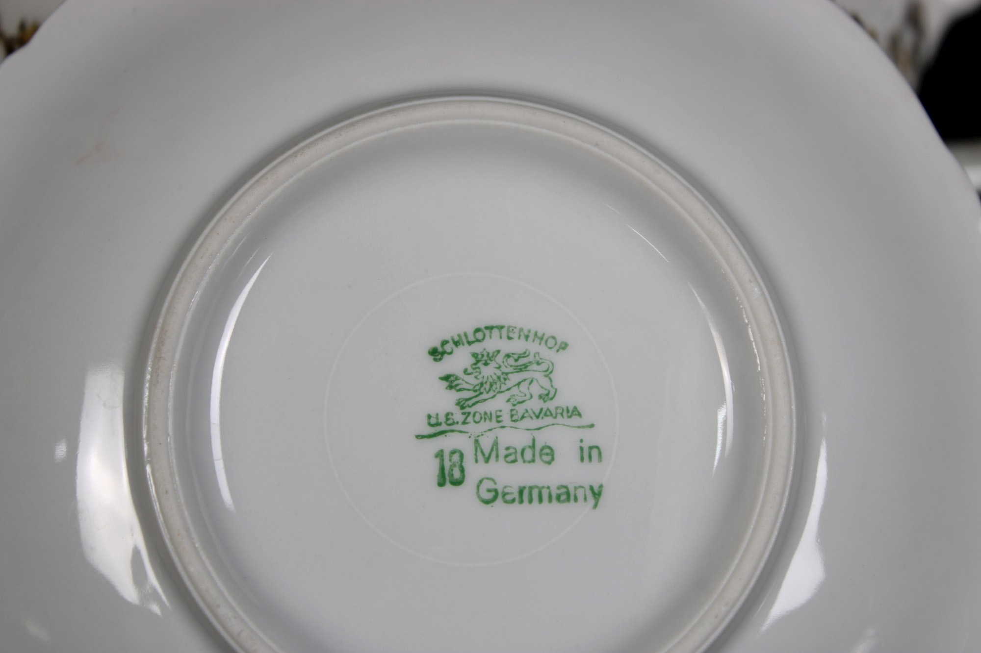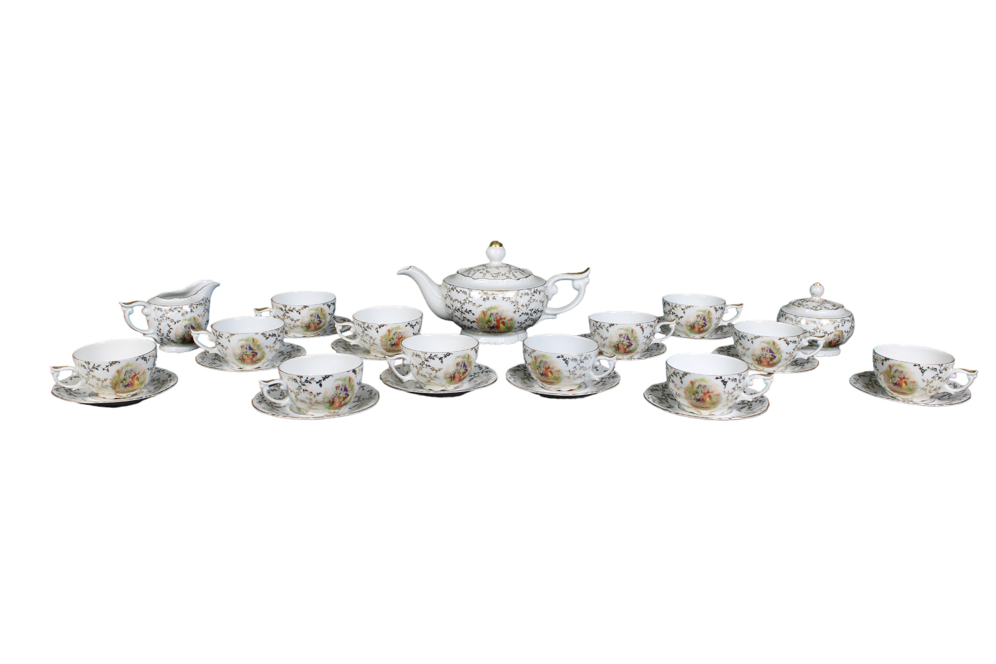 SERVIZIO DA THE COMPOSTO DA teiera, zuccheriera, lattiera e 12 tazze con piattini manifattura Schlottennof Bavaria in porcellana dipinta e lumeggiature in oro Germania primi 900