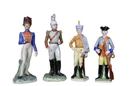 LOTTO DI 4 SCULTURE in porcellana dipinta raffigurante soldati, una con rotture e mancanze Francia XX secolo h cm 25 / h cm 23 / h cm 21