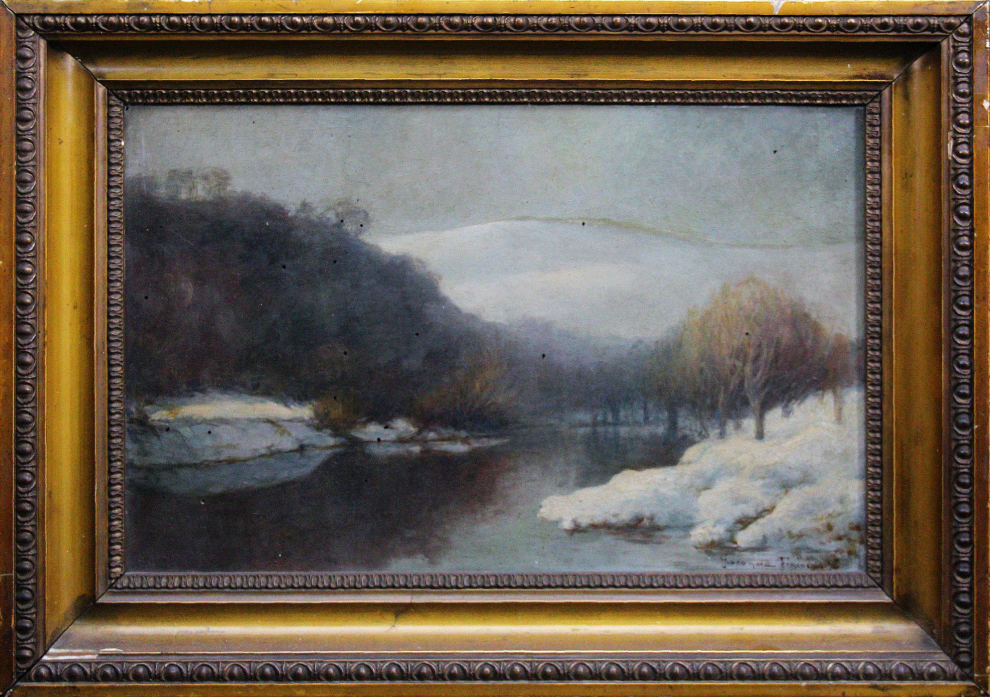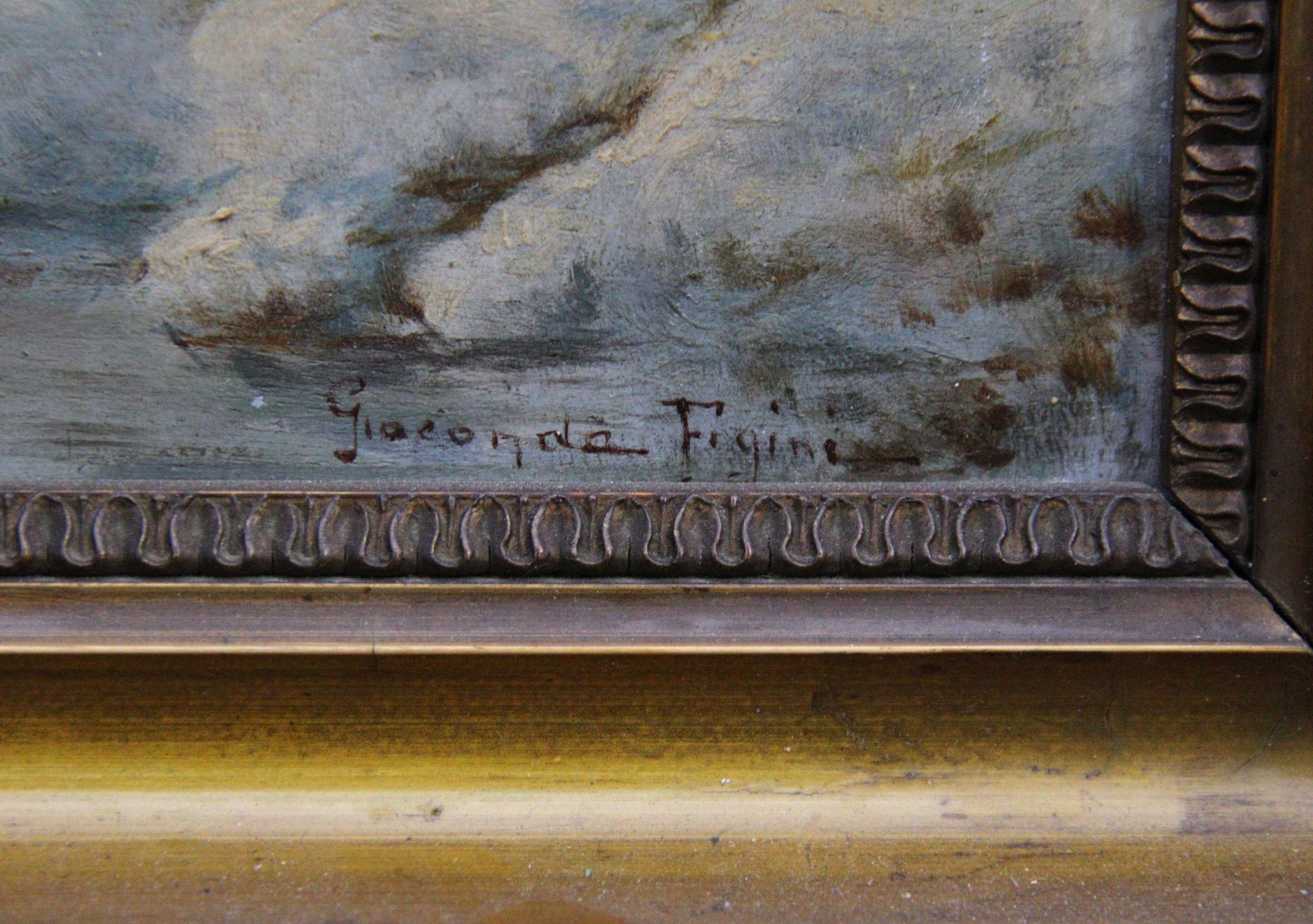 OLIO SU TAVOLA raffigurante paesaggio innevato firmato in basso a destra Gioconda Figini scuola italiana XX secolo h cm 28 x 43