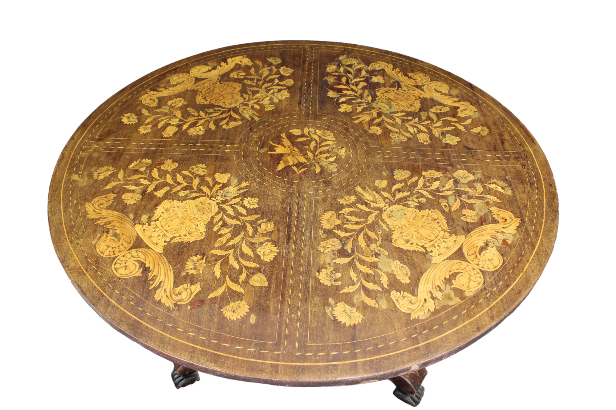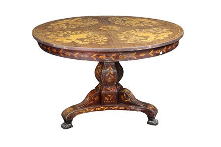 IMPORTANTE TAVOLO DA CENTRO in legno di mogano e intarsiato in varie essenze di legno a motivi di flora e fauna Olanda primi 800 h cm 75 x 116
