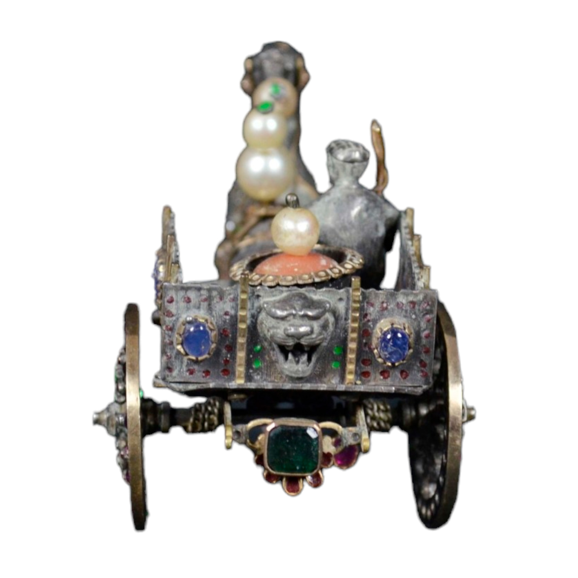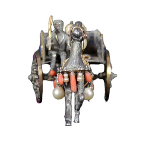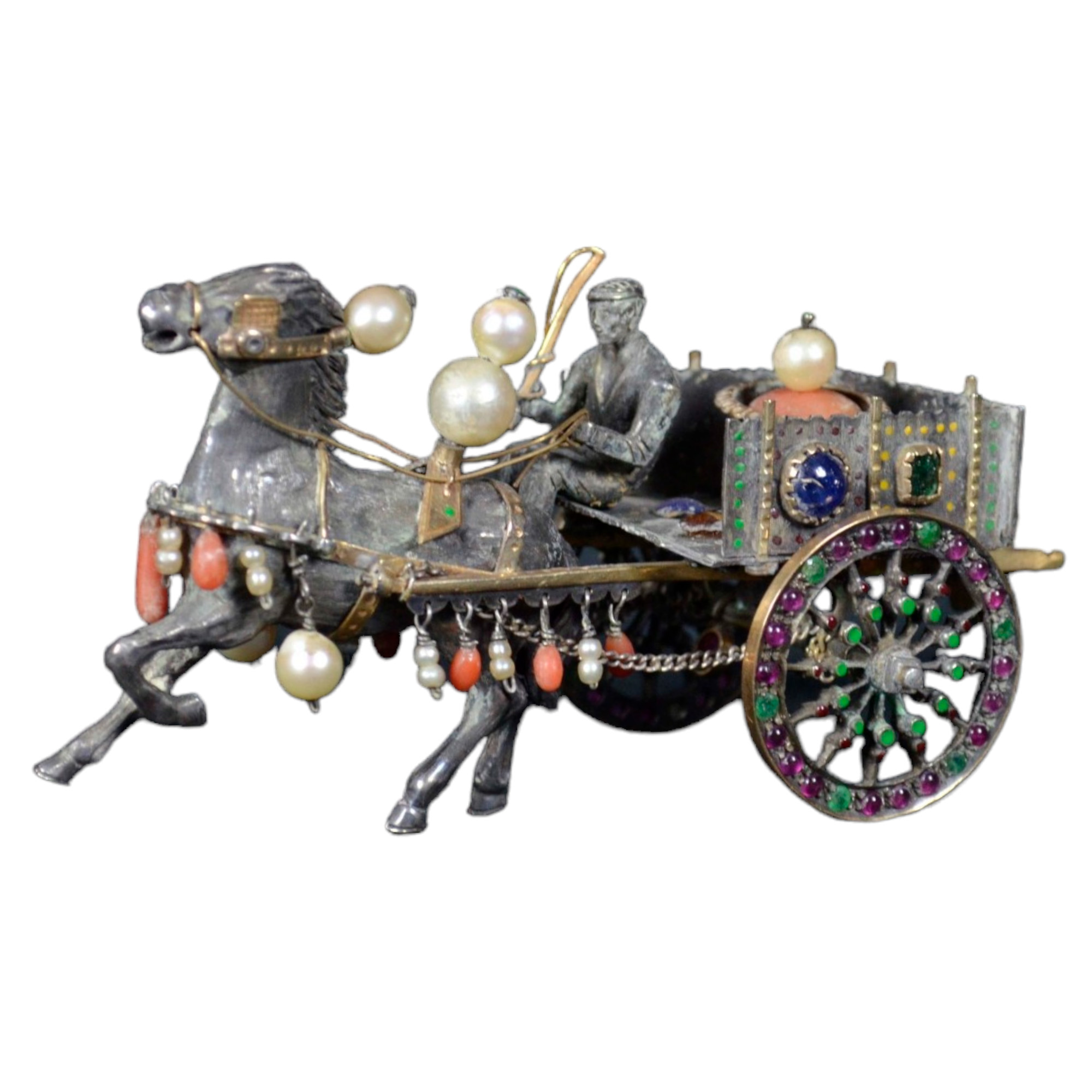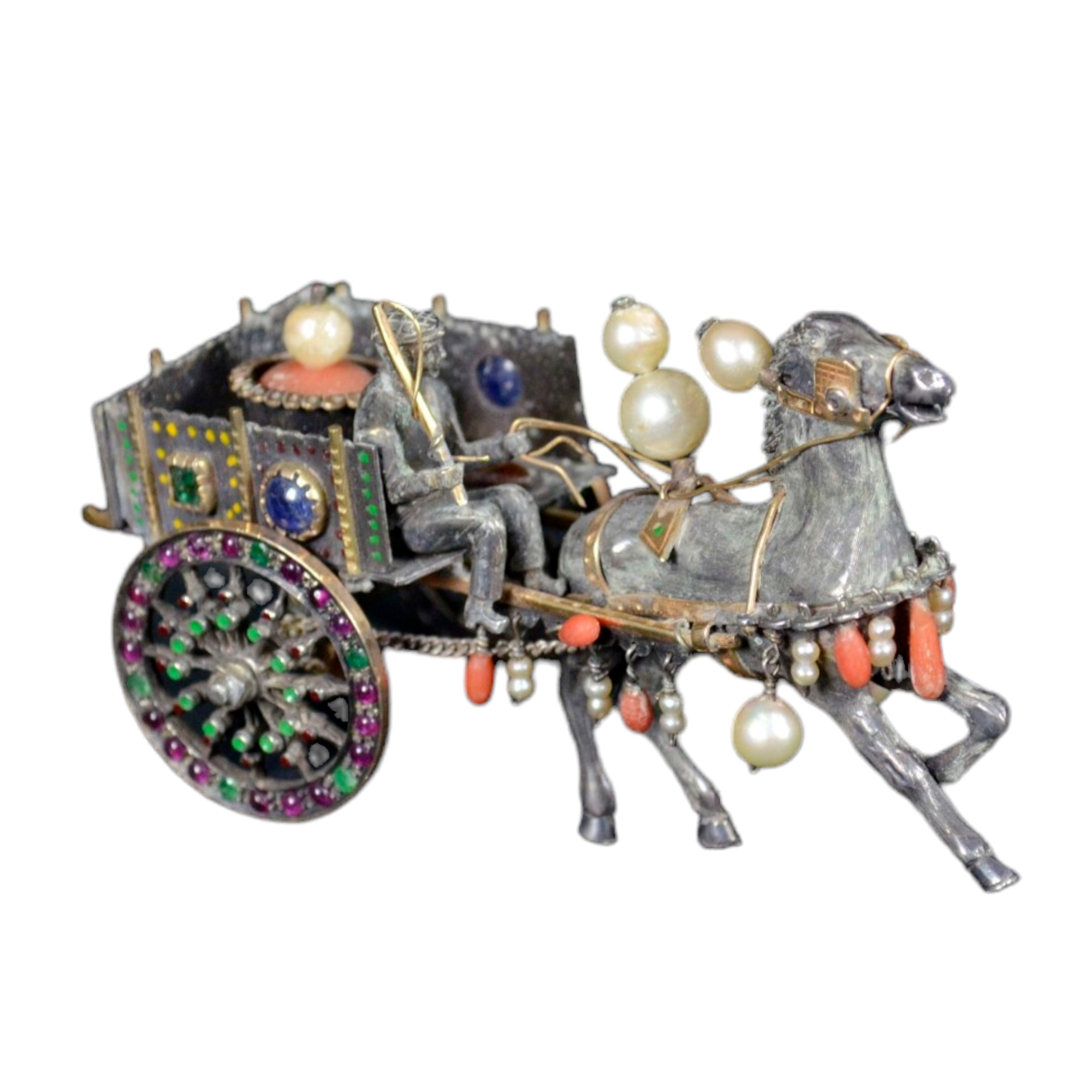 GRUPPO SCULTOREO raffigurante carrettino siciliano con cavallo e personaggi in argento massiccio ed oro arricchito da pietre e materiali preziosi Italia fine 1880-1920 circa h cm 6 x 11 x 4,5