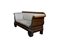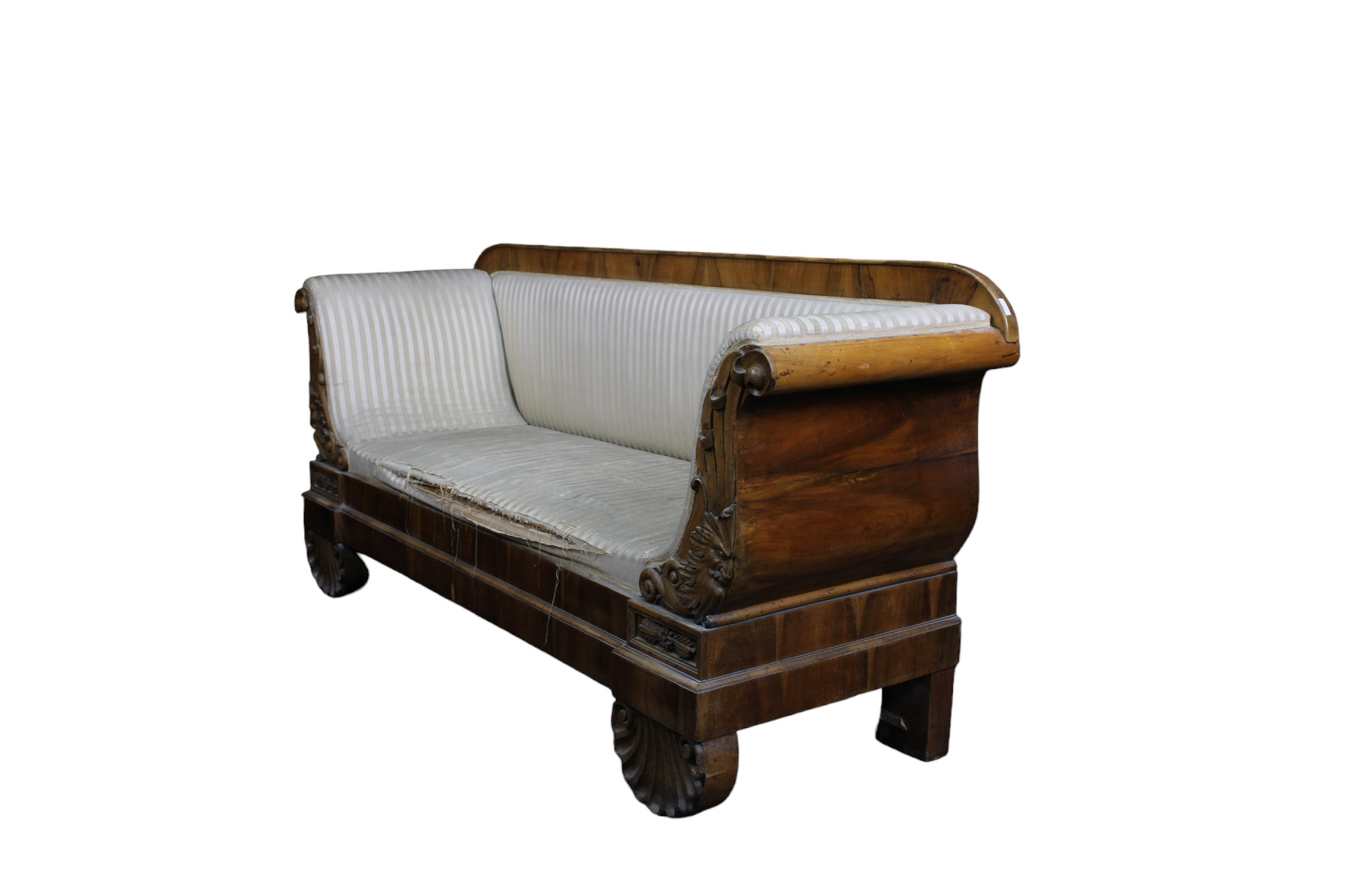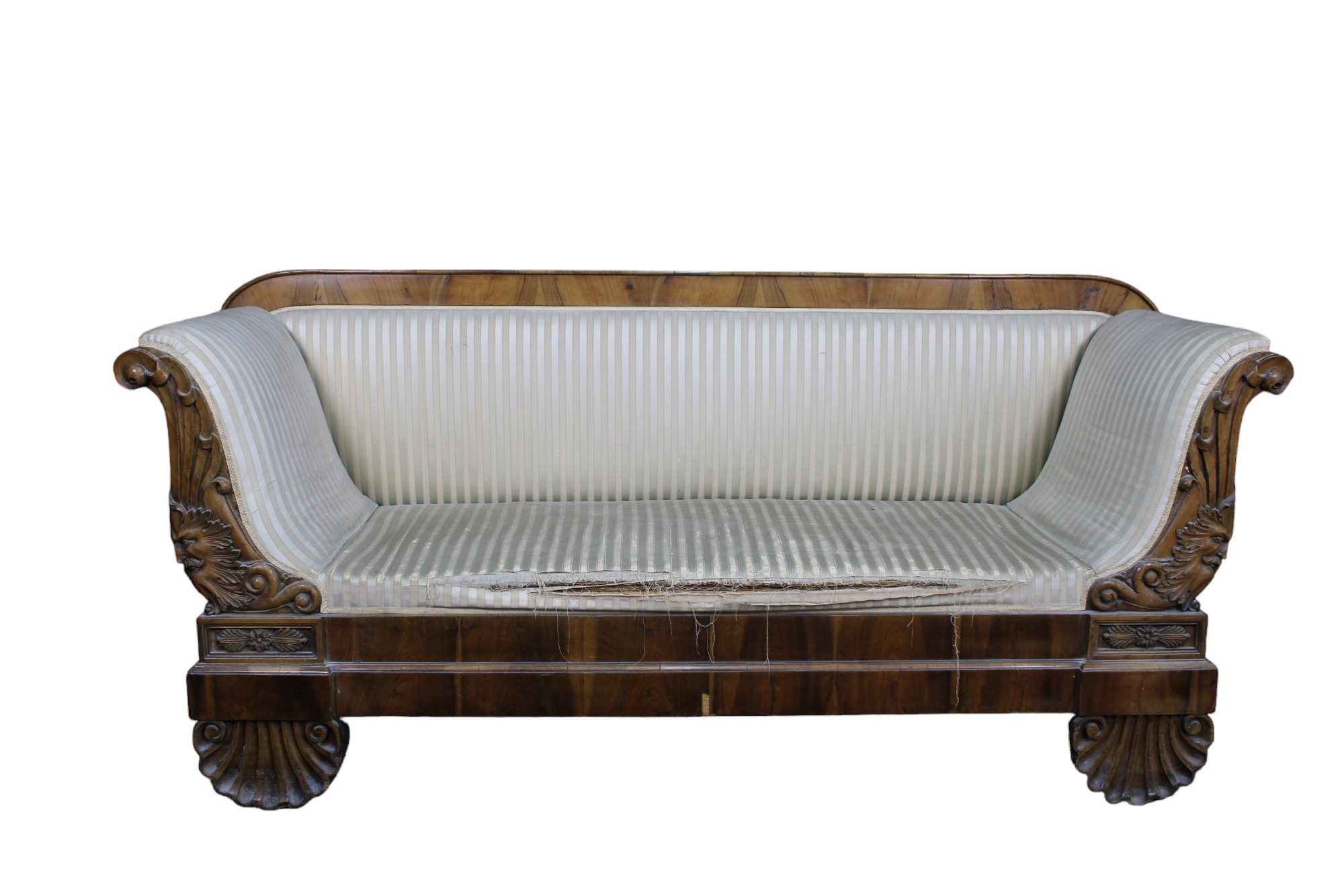 ELEGANTE DIVANO A BARCA in legno di noce scolpito raffigurante figure fantastiche sostenuto da gambe a forma di conchiglia Sicilia primi 800 h cm 103 x 226 x 67