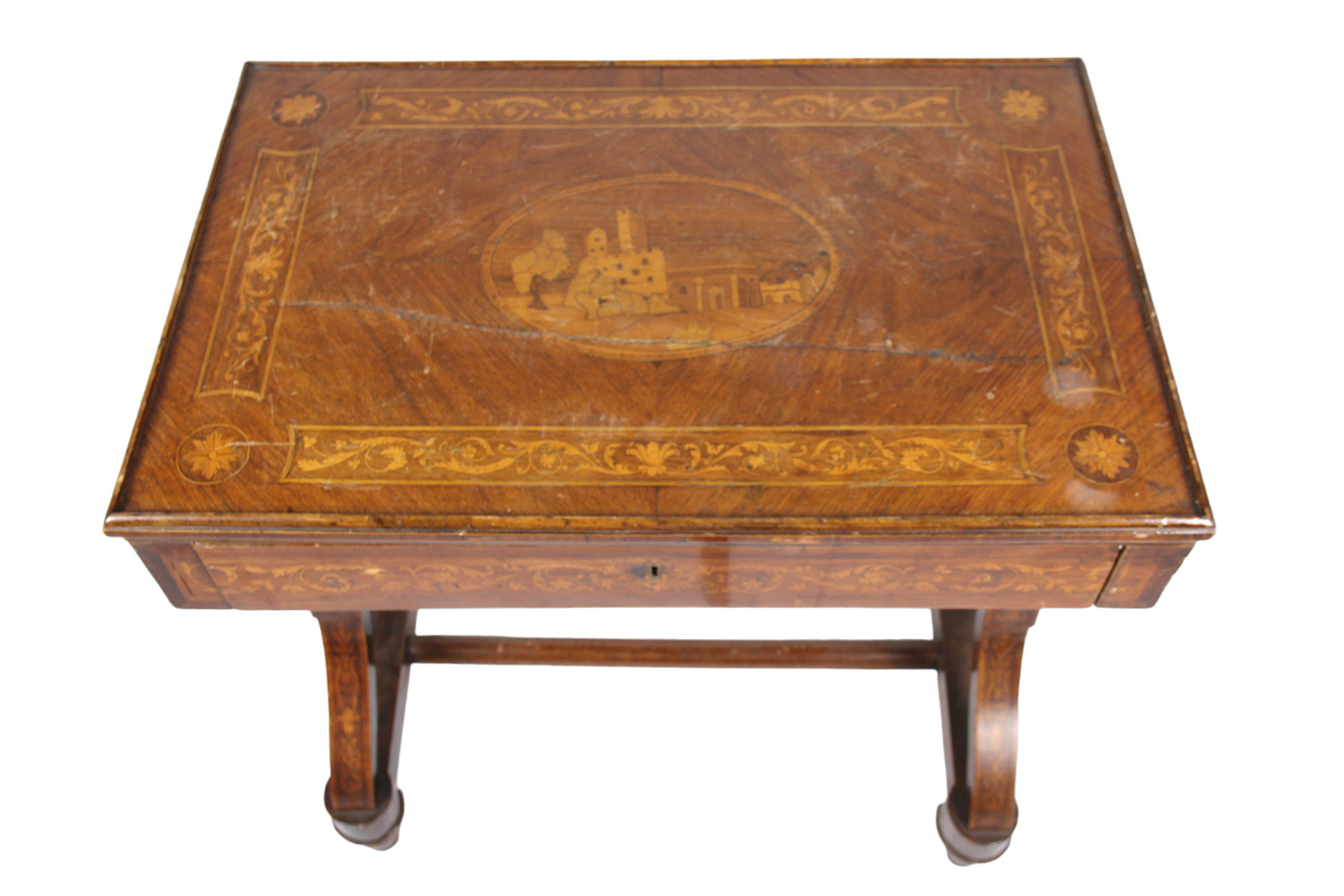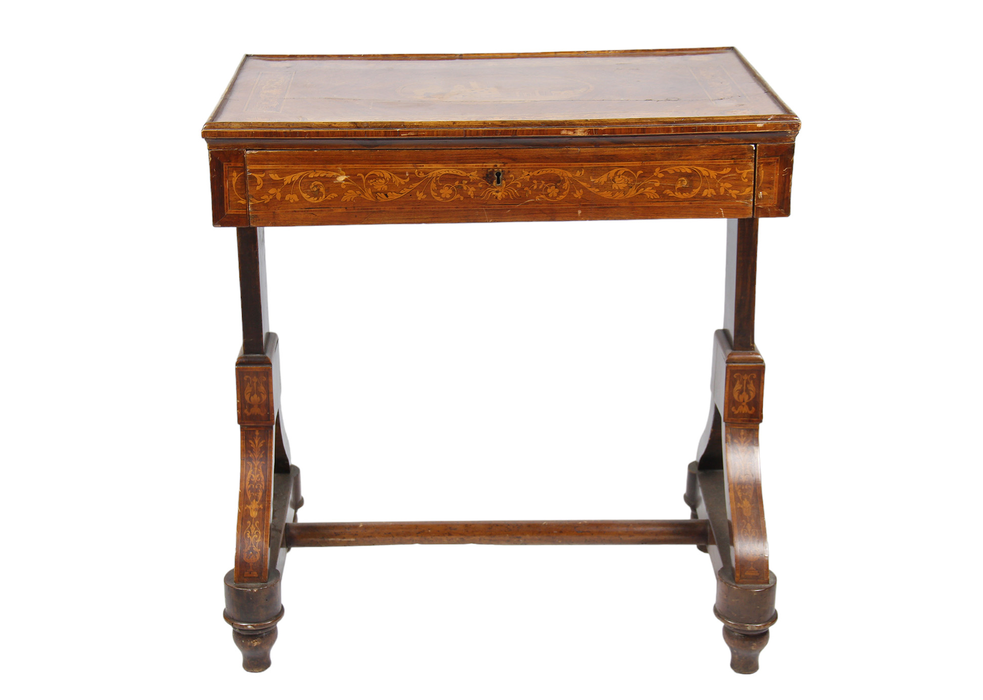 PICCOLO ED ELEGANTE SCRITTOIO di bottega Maggiolini in palissandro ed estese tarsie in bosso al centro del piano è raffigurato paesaggio dentro riserva ovale gambe ad ipsilon raccordate da traversa Lombardia primi 800 h cm 77 x 71 x 47