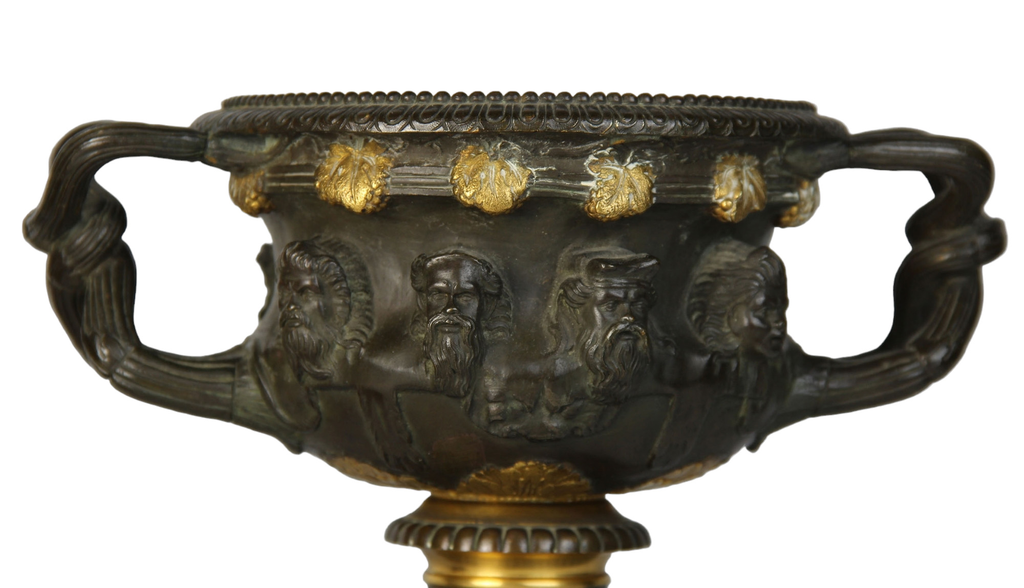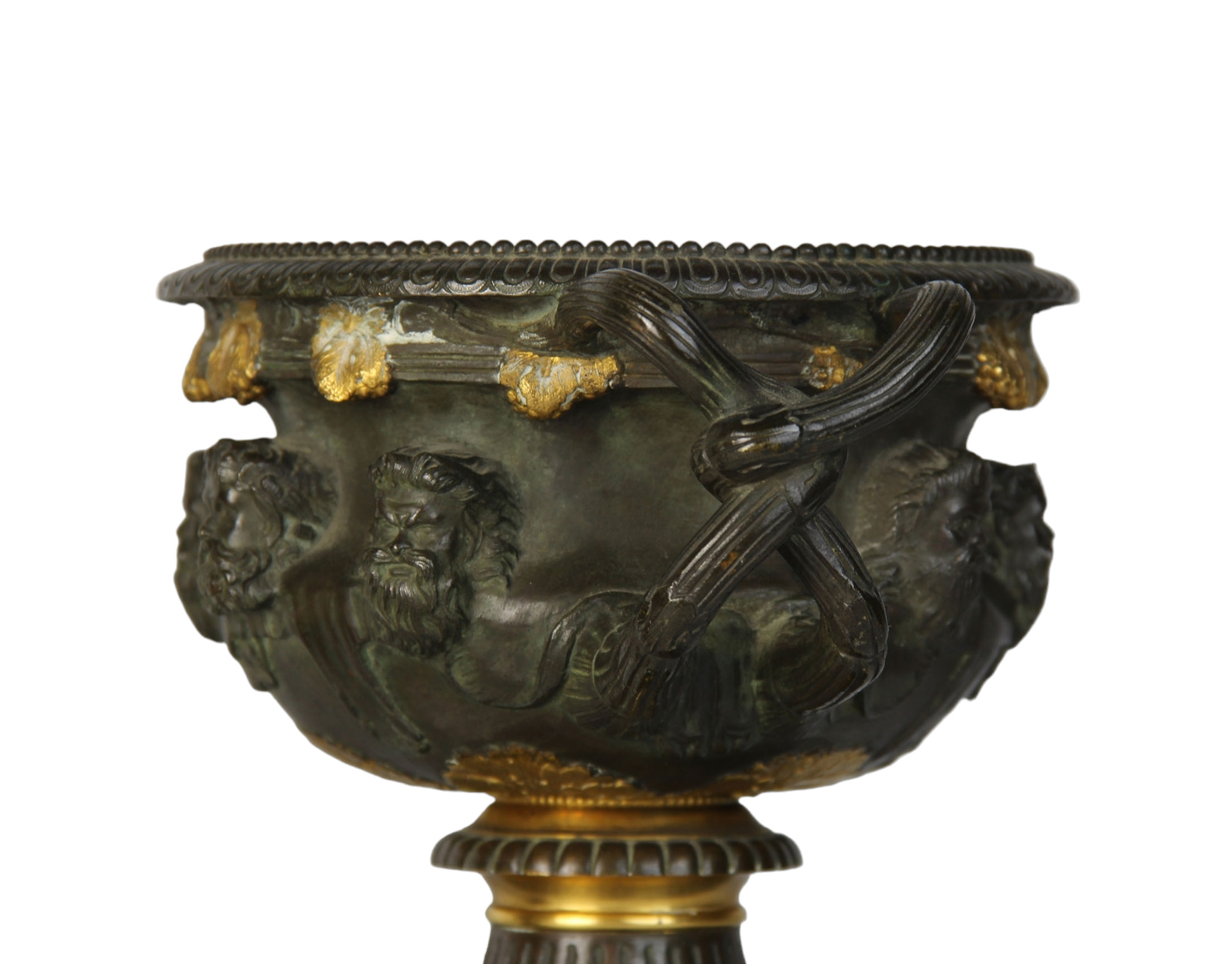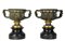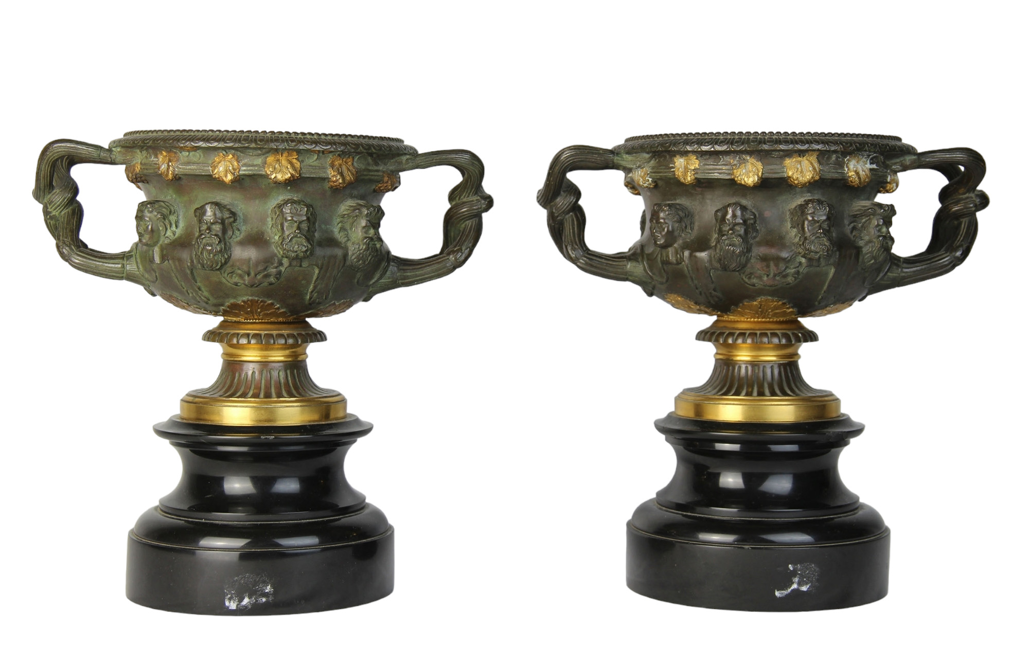 COPPIA DI ELEGANTI VASI A CRATERE in bronzo finemente cesellato brunito e dorato, base in marmo nero del Belgio Francia XIX secolo h cm 22 x 22
