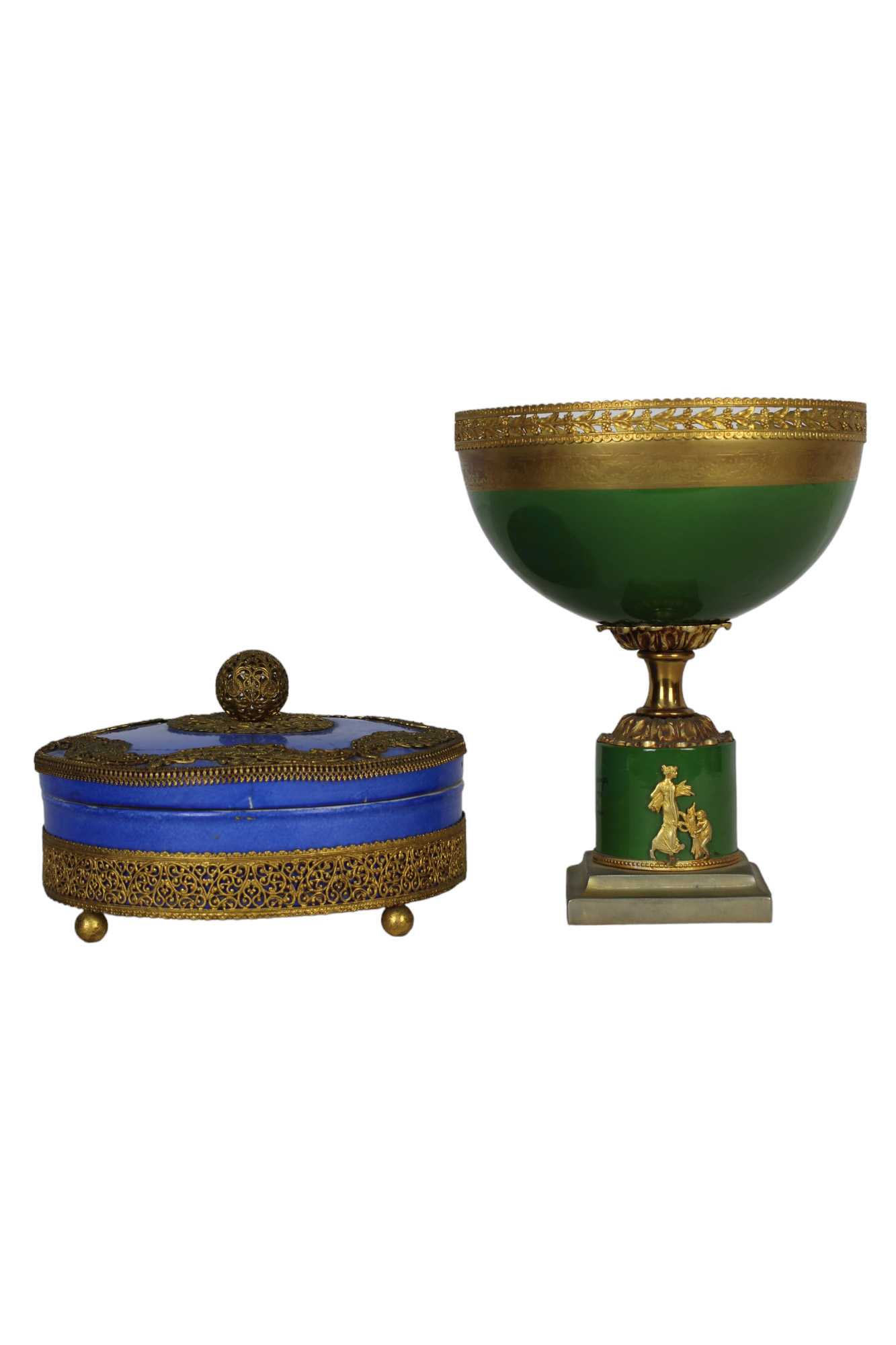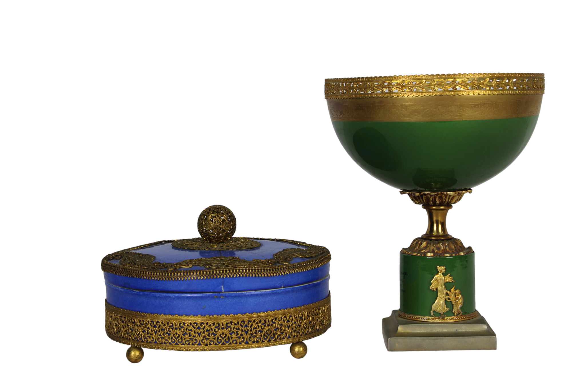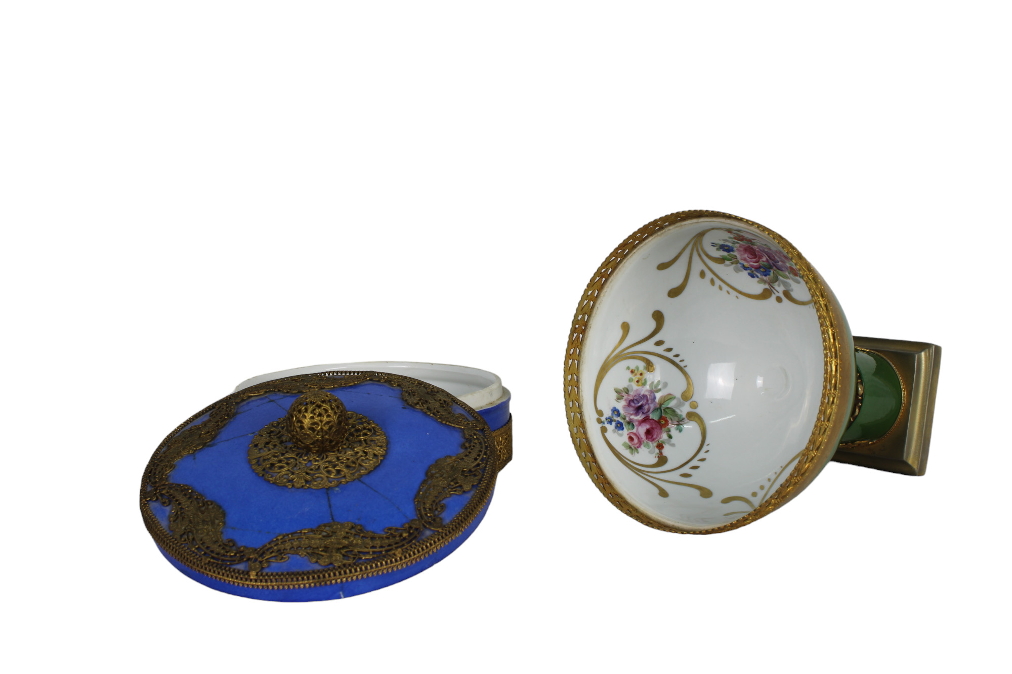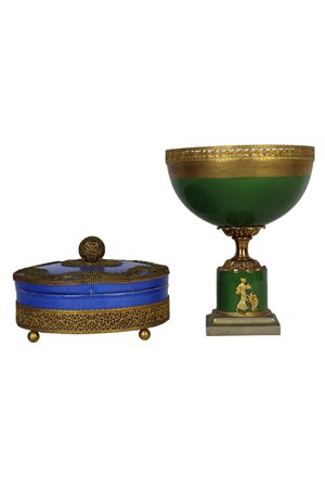 LOTTO COMPOSTA DA 1 alzata in porcellana dipinta montata in metallo dorato finemente cesellato e una scatola in porcellana e metallo dorato (incollagi al coperchio) manifattura inglese primi 900 h cm 18,5 x 15 / h cm 9 x 16