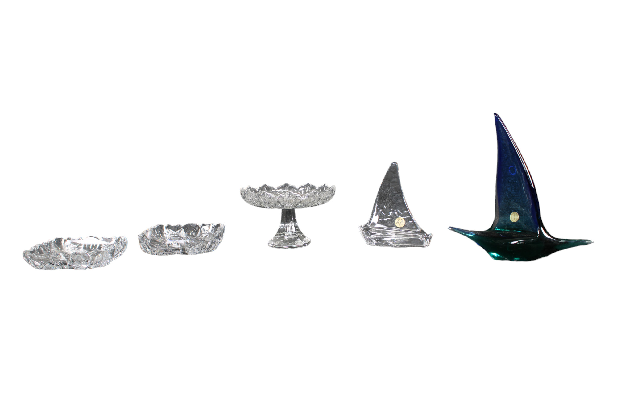 LOTTO COMPOSTO DA 2 POSACENERI, UN ALZATA E 2 VELIERI in vetro, un veliero in vetro trasparente spizzicato alla base XX secolo misure varie