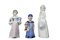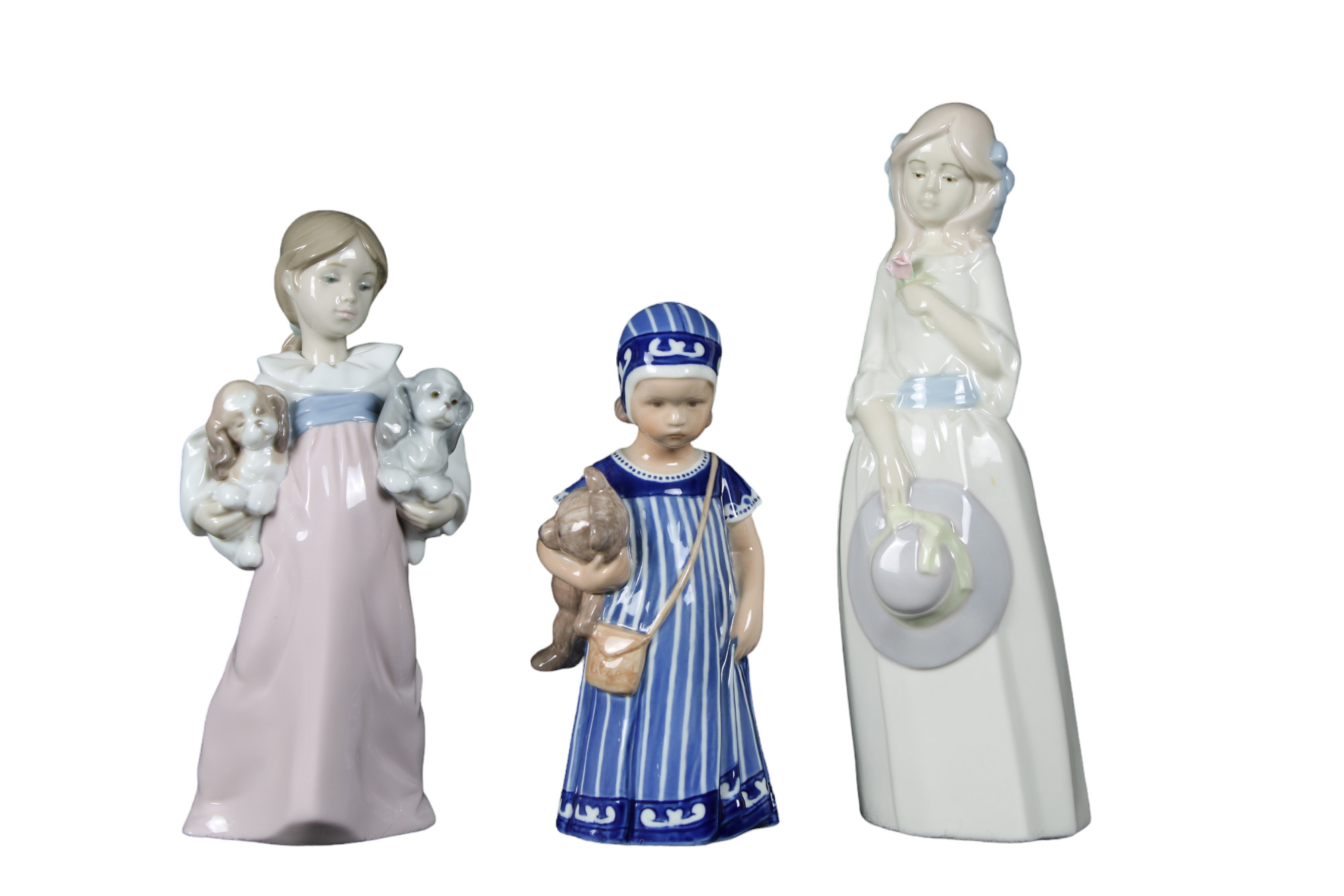 LOTTO COMPOSTO DA 3 sculture in porcellana una raffigurante bambina con peluche manifattura Royal Copenaghen, una scultura raffigurante ragazza con cani e una scultura raffigurante ragazza con cappello manifattura spagnola XX secolo h cm 23 / h cm 19 / h cm 16