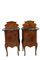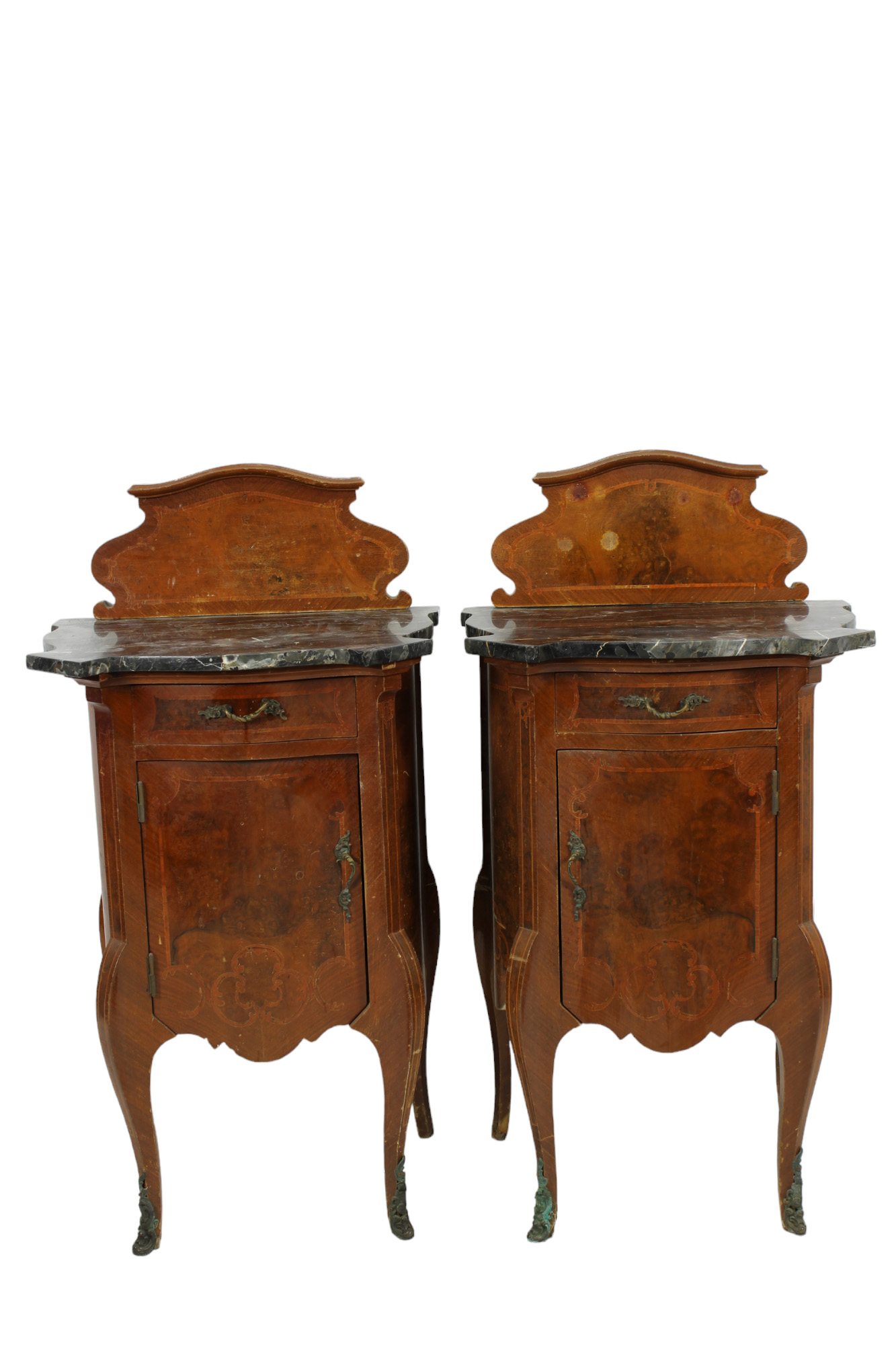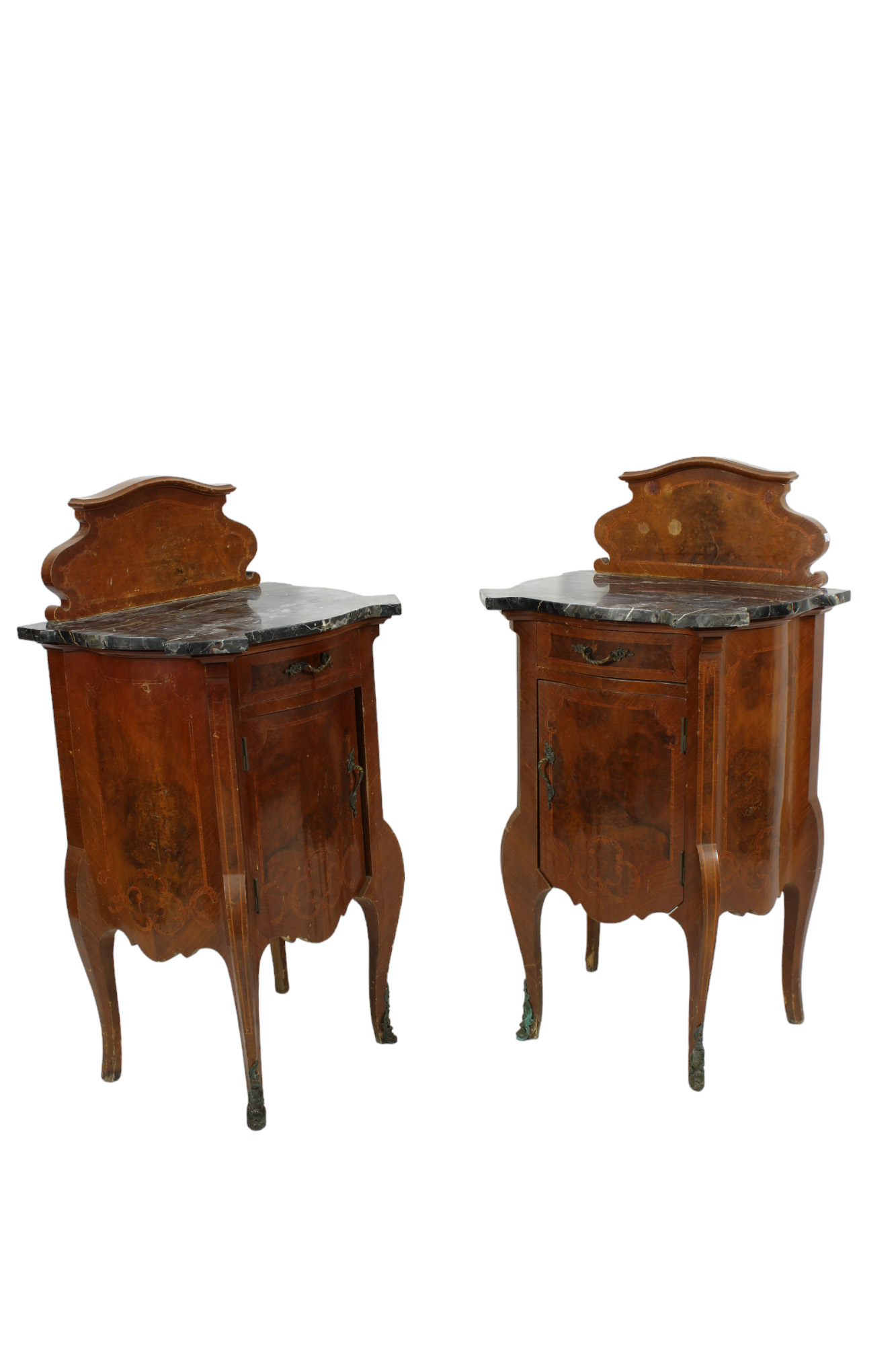 COPPIA DI COMODINI DI GUSTO RETRO' in radica di noce e intarsi in legno di rose e piano in marmo porto oro Sicilia primi 900 h cm 104 x 55 x 43