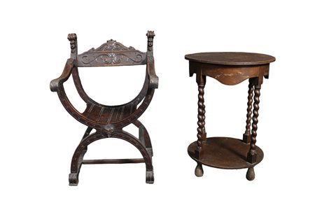 LOTTO COMPOSTO DA una poltrona savonarola in legno scolpito e un tavolino di forma circolare con gambe a colonne tornite Sicilia XIX/XX secolo h cm 70 x 50 / h cm 84 x 53 x 50